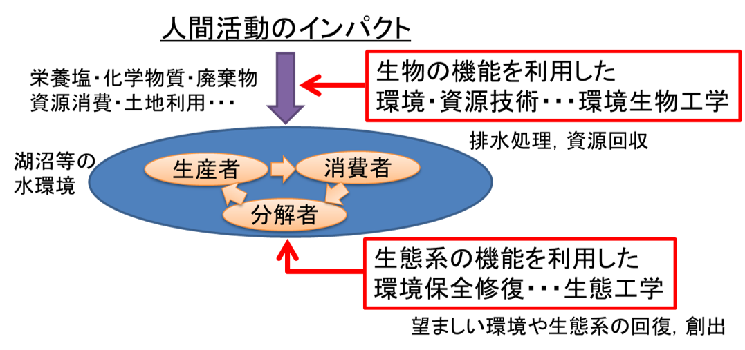 人類の急激な産業活動の発展は我々に豊かな社会をもたらしましたが、一方で資源の濫用・廃棄物増加などに伴う生態系の破壊・劣化が問題となってきました。生態工学は、持続可能な循環型社会の構築のため、生態系のしくみ・機能を解明し工学的手法を駆使して応用する研究分野です。