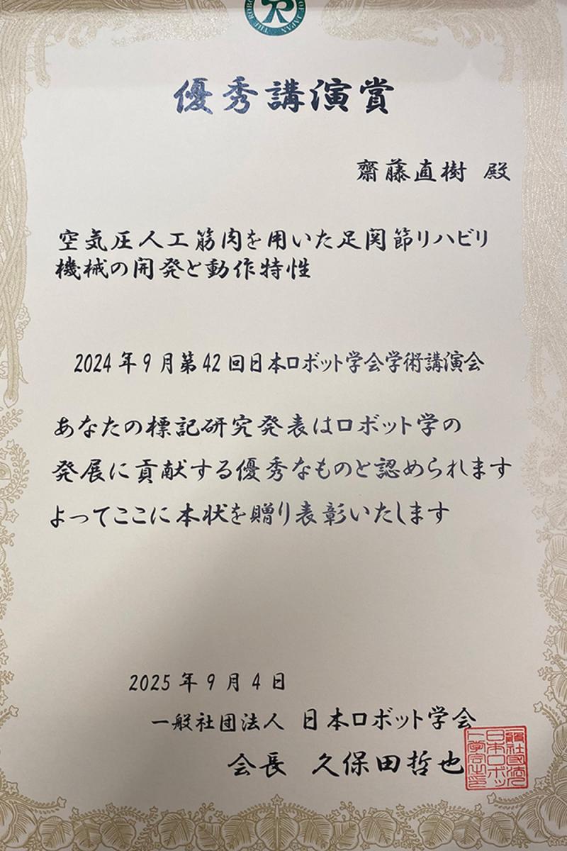 本賞は、日本ロボット学会学術講演会にて、全登壇者(発表件数806件)の中から、ロボット学の発展に貢献する優秀な発表と認められたものに対して贈られるもので、昨年発表した足関節リハビリシステムに関する研究「空気圧人工筋肉を用いた足関節リハビリ機械の開発と動作特性」が評価されました。