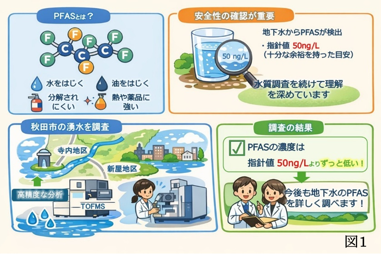 秋田県では、令和7年度に秋田市の茨島地区周辺の地下水からPFASが検出されたことを受け、地下水中でどのくらいPFASが存在しているのかを確かめることが重要な課題となっています。PFASは、すぐに環境基準が設けられる段階ではありませんが、今後の理解を深めるために調査が続けられている「要監視項目」※2です。県内でも一部の地下水や河川などで調査が行われていますが、詳しい状況はまだ十分に分かっていません。そこで今回、生物環境科学科4年生の卒業研究で、まだ調査が行われていない秋田市の寺内地区と新屋地区の代表的な地下水(湧水)に含まれるPFASの濃度実態を調べました(図2)。