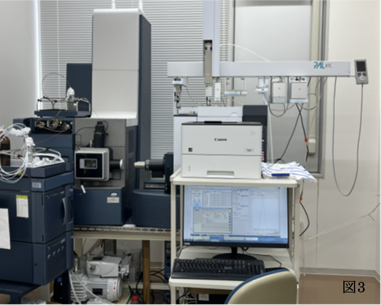 分析には、本学で所有し、学生実験や研究で活用している高精度の質量分析装置(TOFMS)を使用しました(図3)。その結果、両地区の湧水に含まれるPFASの濃度は、指針値の50 ng/Lを大きく下回るものであることが分かりました。つまり、今回調査した範囲では、安全性が懸念されるレベルではないことが確認されました。