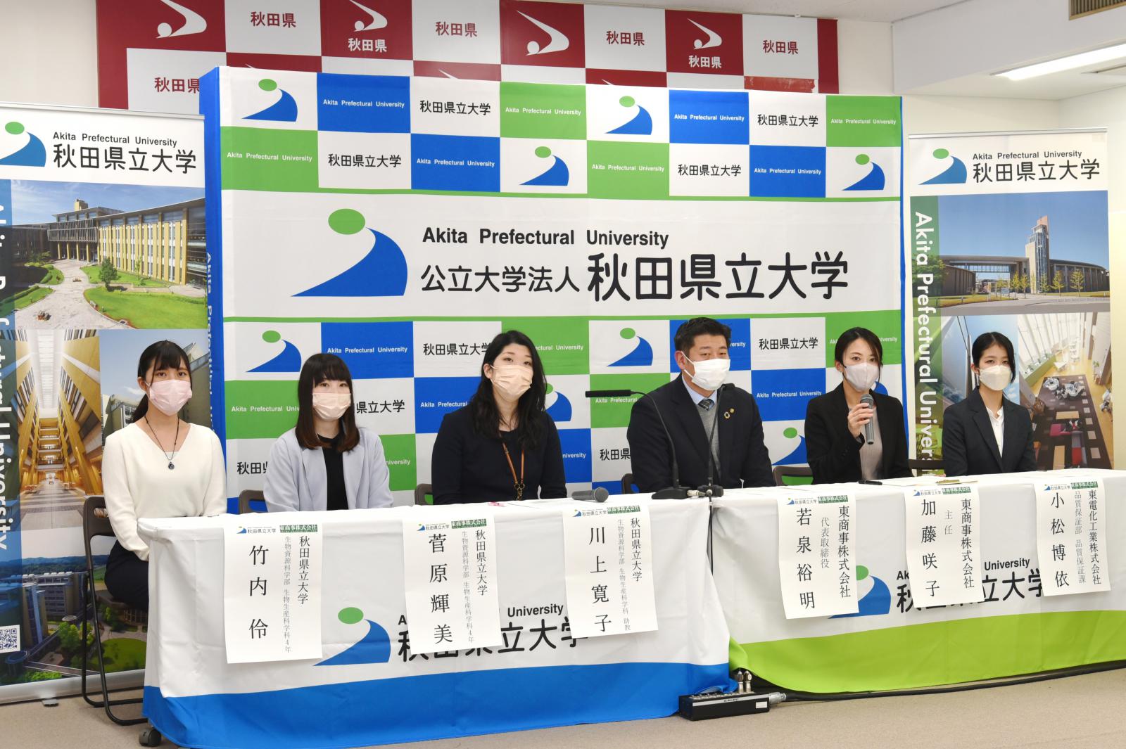 生物資源科学部生物生産科学科の 川上 寛子助教(植物資源創成システム研究室 [専門:植物工学])が指導した学生自主研究および卒業研究の成果と、自社ファームでエゴマの栽培や加工を手掛ける東商事㈱等との共同プロジェクトにより、ハンド&ボディクリーム『N/A(エヌエー)』が完成し、12月20日(火)、秋田県庁でお披露目されました。エゴマはシソ科に属する植物で、種子から油を搾油されて利用されるほか、一部地域で葉も食用に用いられています。東商事㈱はエゴマから「エゴマ油」を生産した後に大量に廃棄せざるを得ない搾かすの活用方法について検討していました。
