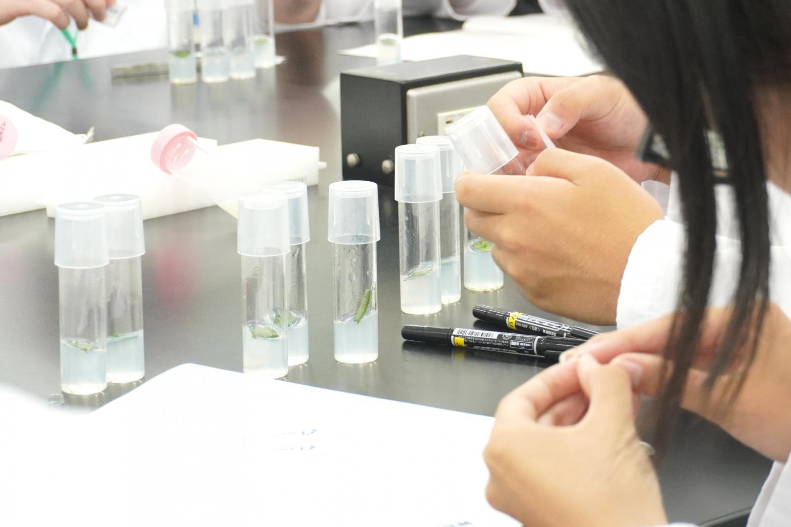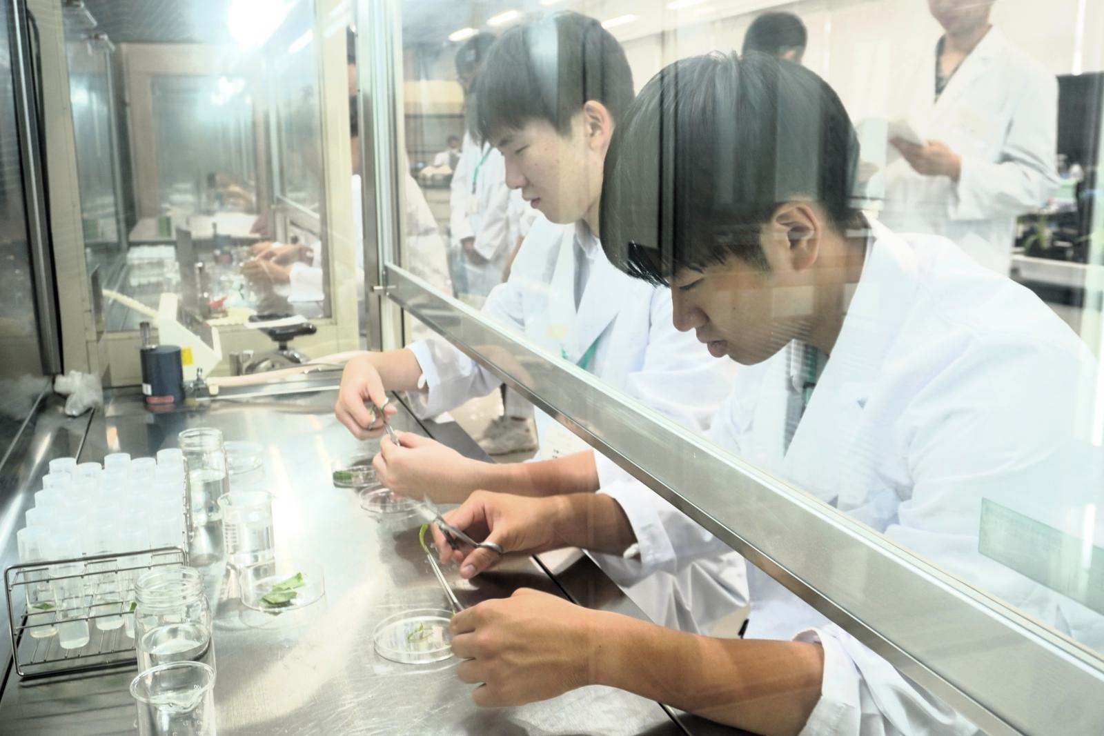 8月5日(火)、秋田キャンパスで「ハイレベル講座」を開催しました。本講座は、県内の高校生を対象に、高校で学んだ内容を発展させ、大学の専門的な学びを体験できる講座です。生物コース「植物の全能性 ~葉っぱ1枚から個体が再生できる?~」(講師:アグリビジネス学科/先進園芸技術開発プロジェクトの神田 啓臣 准教授[専門:花き園芸学])と、化学コース「カフェインを抽出・単離してみよう」(講師:応用生物科学科/植物機能研究グループの常盤野 哲生 准教授[専門:天然物化学])の2コースが開講され、生物資源に関して興味・関心あふれる高校生35名(生物16名、化学19名)に受講して頂きました。