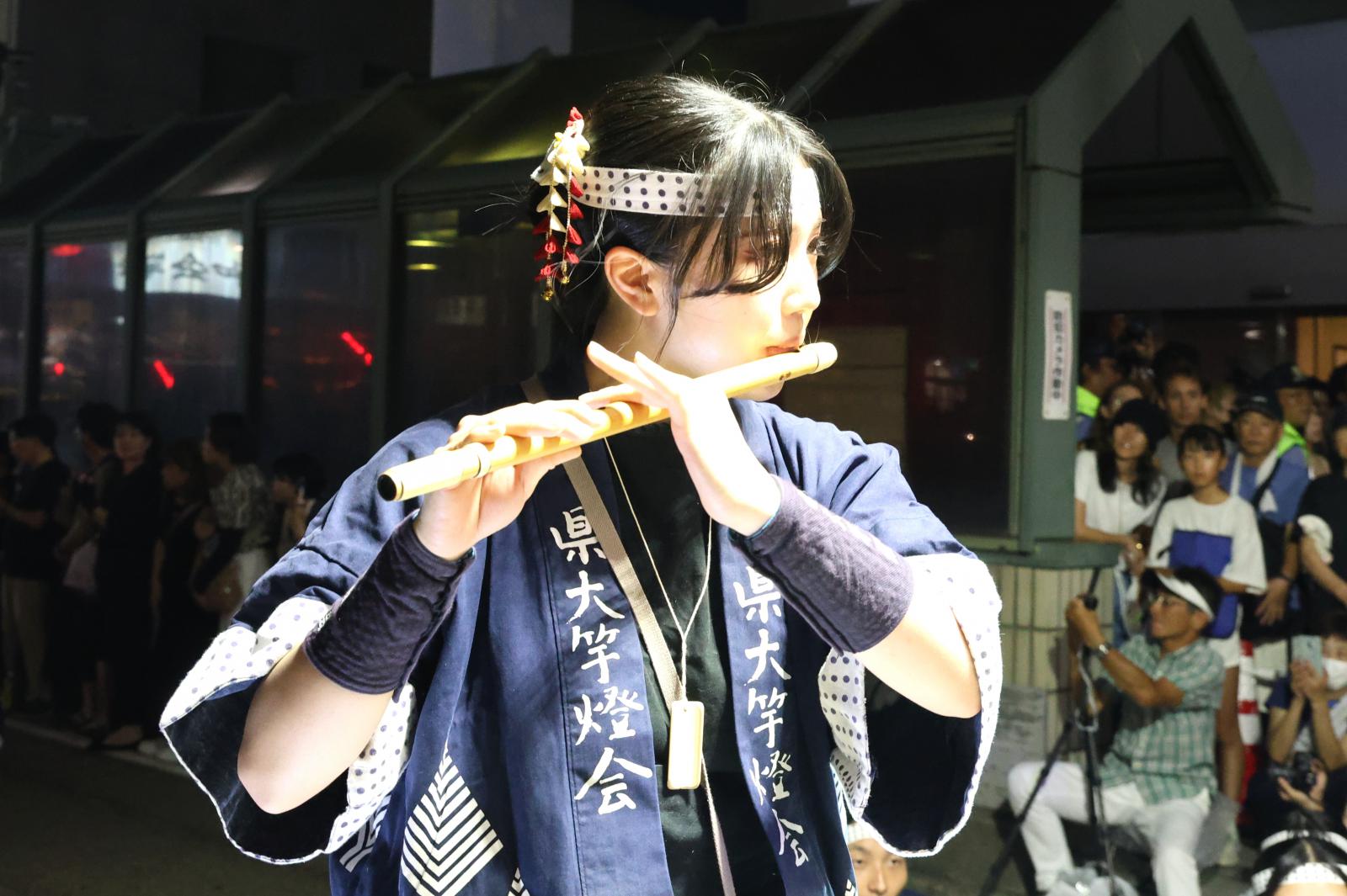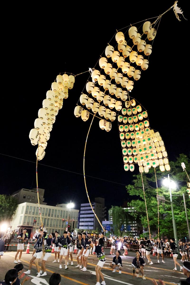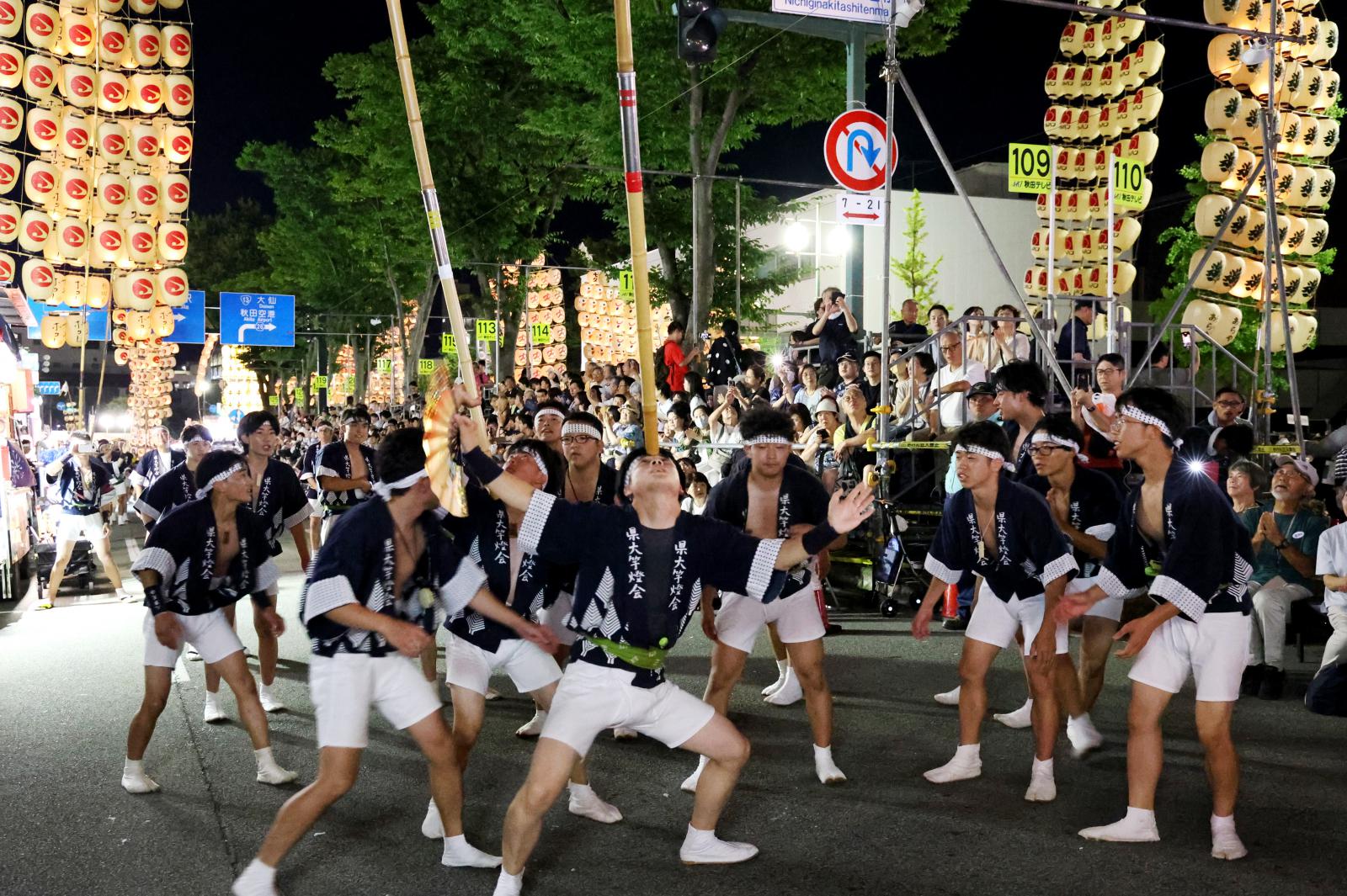 竿燈大通りで行われた夜竿燈では熱のこもった演技を披露して、県大の大若提灯が、夜空に美しい光の稲穂を実らせました。また、秋田駅前アゴラ広場や秋田県庁前での合同出竿でも、県内外から集まった観客を魅了、たくさんのお客様から温かい声援をいただき大変励みになりました。今後も、秋田県立大学竿燈会へのご支援のほどよろしくお願いいたします。