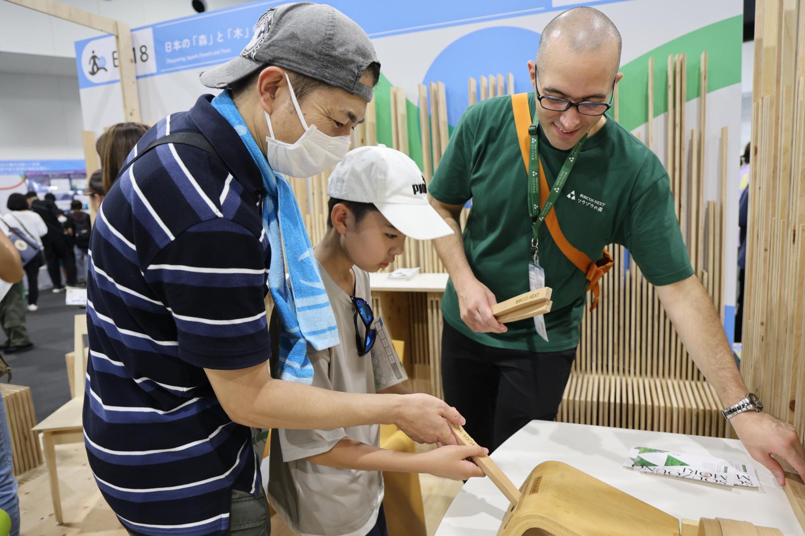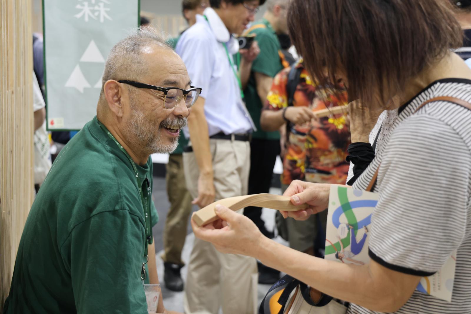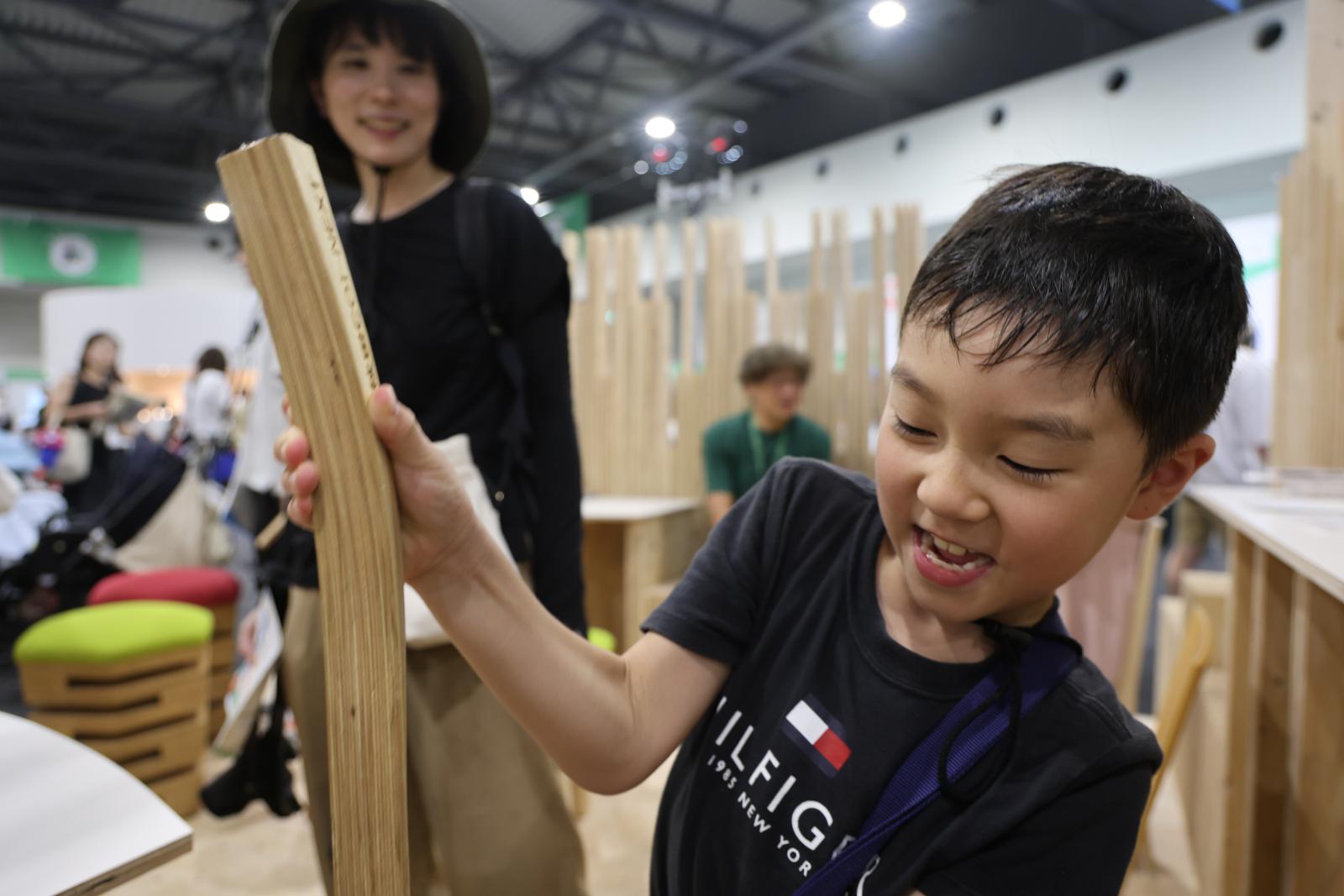 イベント期間は夏休みということもあり、ご家族連れの方を中心に、全国、そして世界から多くの方が訪れてくださいました。特に、薄い木の板を特殊な接着剤で固め、手で簡単に曲げることのできる「やわらかい木」や、木材の特殊な構造によるユニークな座り心地の「バネバネの木の椅子」、そして重さわずか1.1kgと世界⼀軽量な⽊⼯椅⼦「折り紙チェアー(秋田公立美術大学による出展)」など、触って体験いただける木材加工品は大好評。体験いただいた方からは、「マジックみたい!」「面白い!」とたくさんの嬉しい声をいただきました。