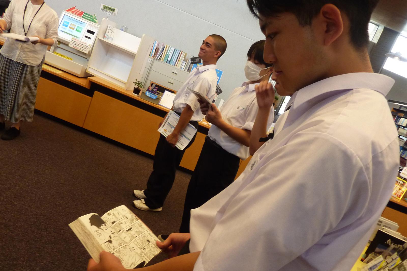 施設見学では、大学内の特徴的な施設を中心にご案内しました。図書館では、各自が興味のある分野の本を手に取るなど、大学ならではの専門的な蔵書に興味津々。図書館の中にありながら、学生同士が活発に議論するグループ学習やプレゼンテーションの練習に活用できる共有スペース「ラーニング・コモンズ」にも驚きの声があがりました。また、広々とした講堂に入ると「映画館みたい!」と歓声が上がり、授業だけではなく、入学式や卒業式といった式典でも使われることを説明すると、学生生活を想像して胸を膨らませているようでした。
