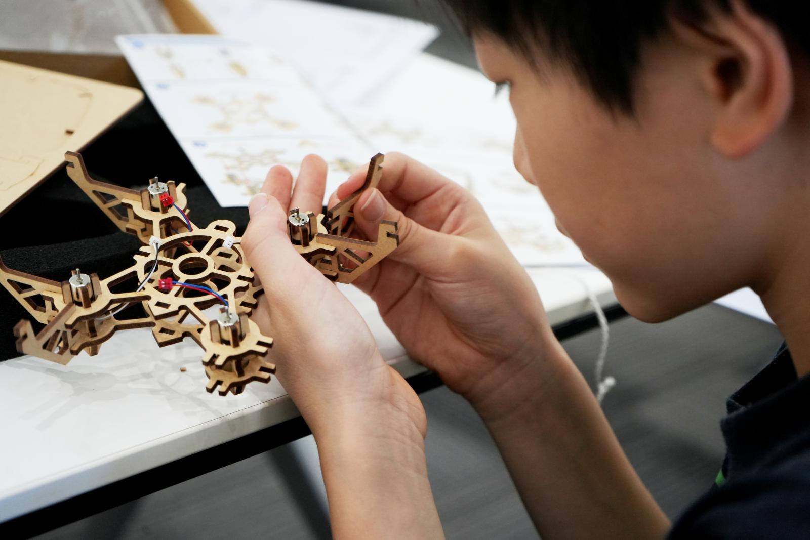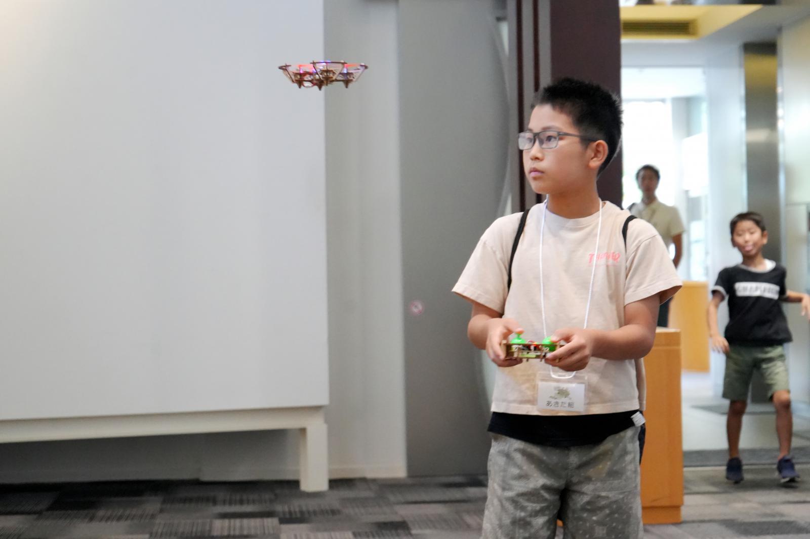 ドローンとは何なのか、ドローンが飛ぶ仕組み、ドローンの活用方法などについて座学で学んだ後に、市販の簡単なキット(クアッドコプターと呼ばれる手のひらサイズ(重量60g)のドローンを組み立て、実際に飛ばしてみることで、体験的にドローンの飛行原理を理解しました。