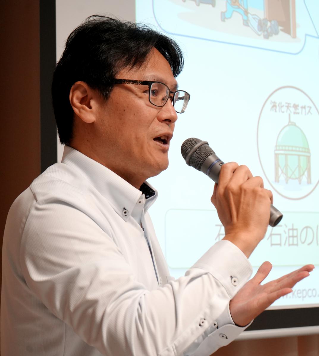自然の力を利用して電気エネルギーを作り出す環境発電が様々な場所で利用されていますが、特に秋田県は、風力発電と地熱発電を主力に再生可能エネルギーの導入を積極的に進めている現状等を理解しました。また、直流電流により冷却・加熱を自由に行える「ペルチェ素子」という熱電変換素子を用いて、熱エネルギーを電気エネルギーに変換する「熱電発電」も体験。冷たい氷の上に「ペルチェ素子」を設置し手を押し当て、”温度差”によりで発電し小さい風車が回り始めた時は、大きな歓声が上がりました。