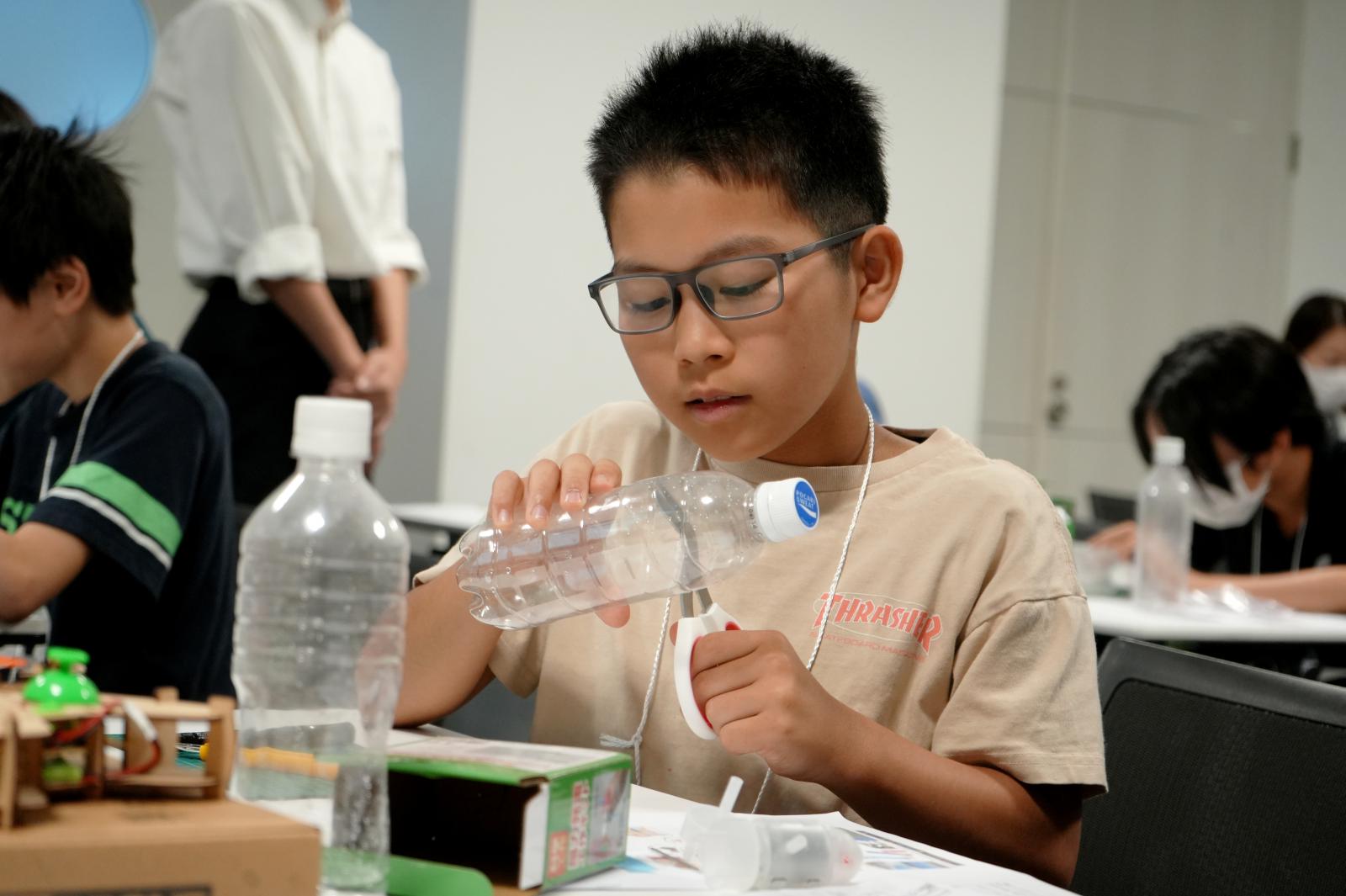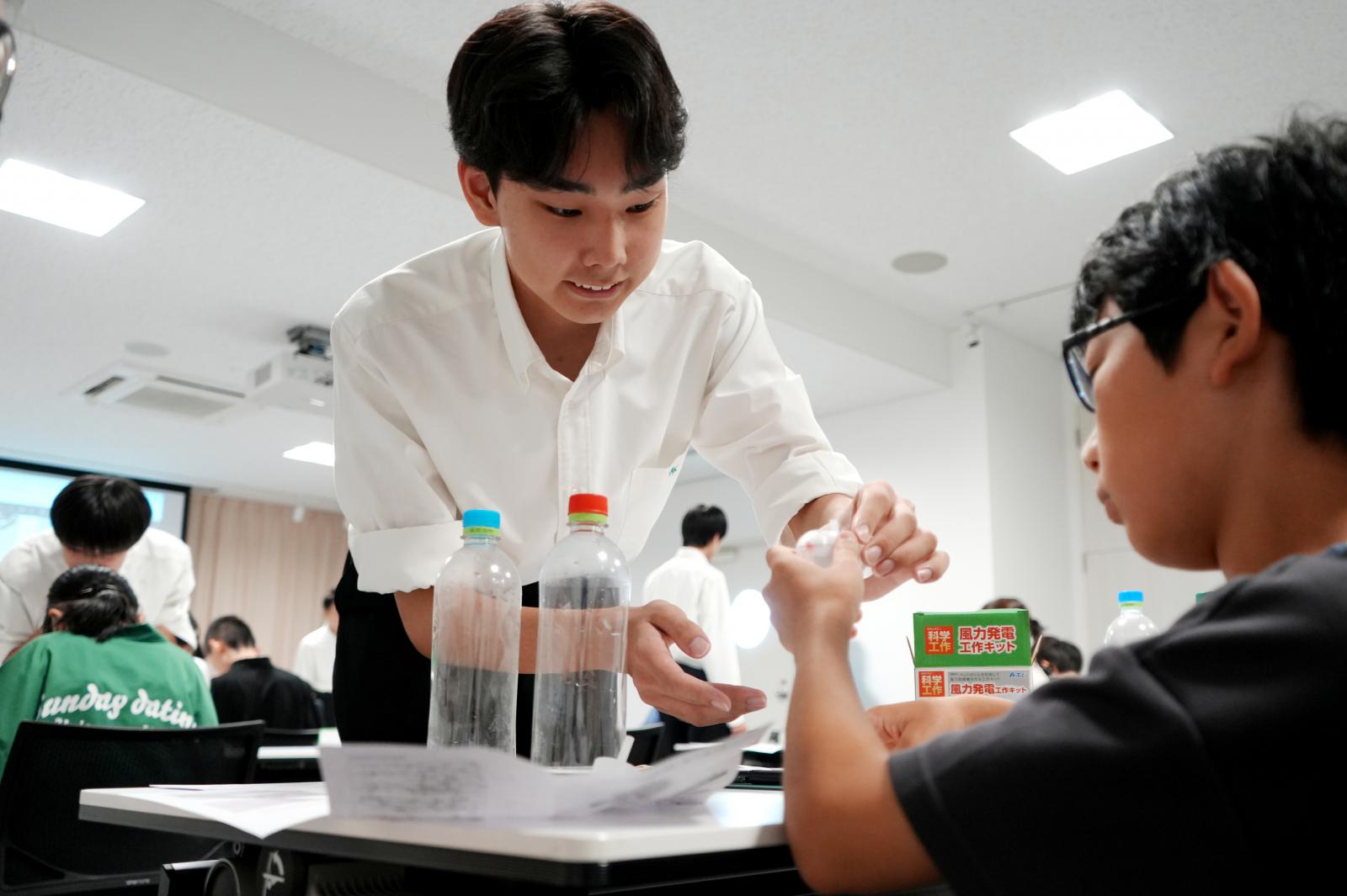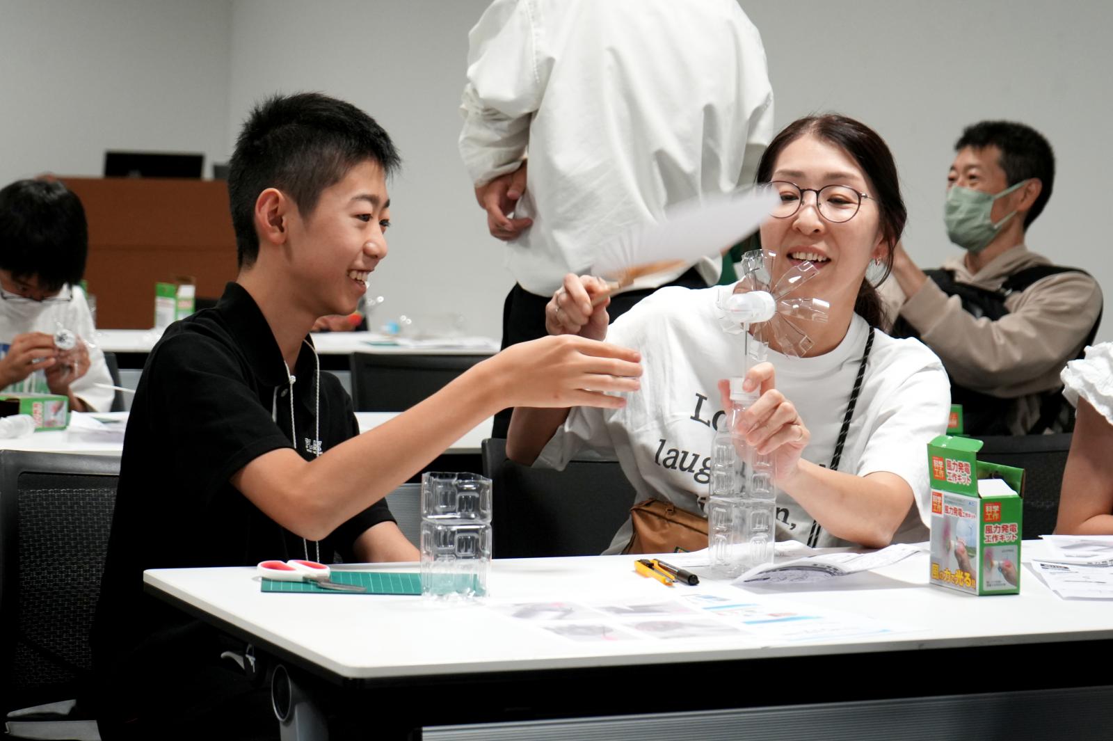 風力発電、太陽光発電、地熱発電について学んだ後、ペットボトルで風車を作り、実際に団扇で風を当てて発電量を計測しました。太陽光発電では太陽光パネルとライトを使ったデモを行い、地熱発電では「ペルチェ素子」を使って氷と体温の温度差で発電する体験をしました。