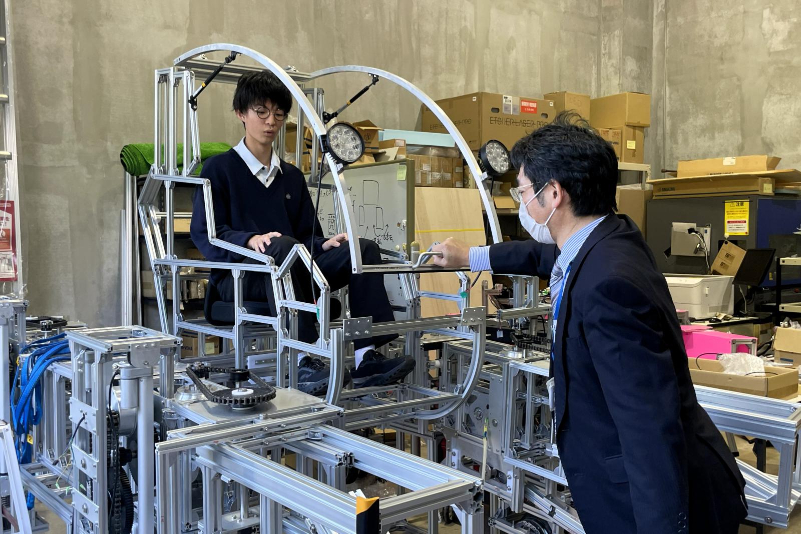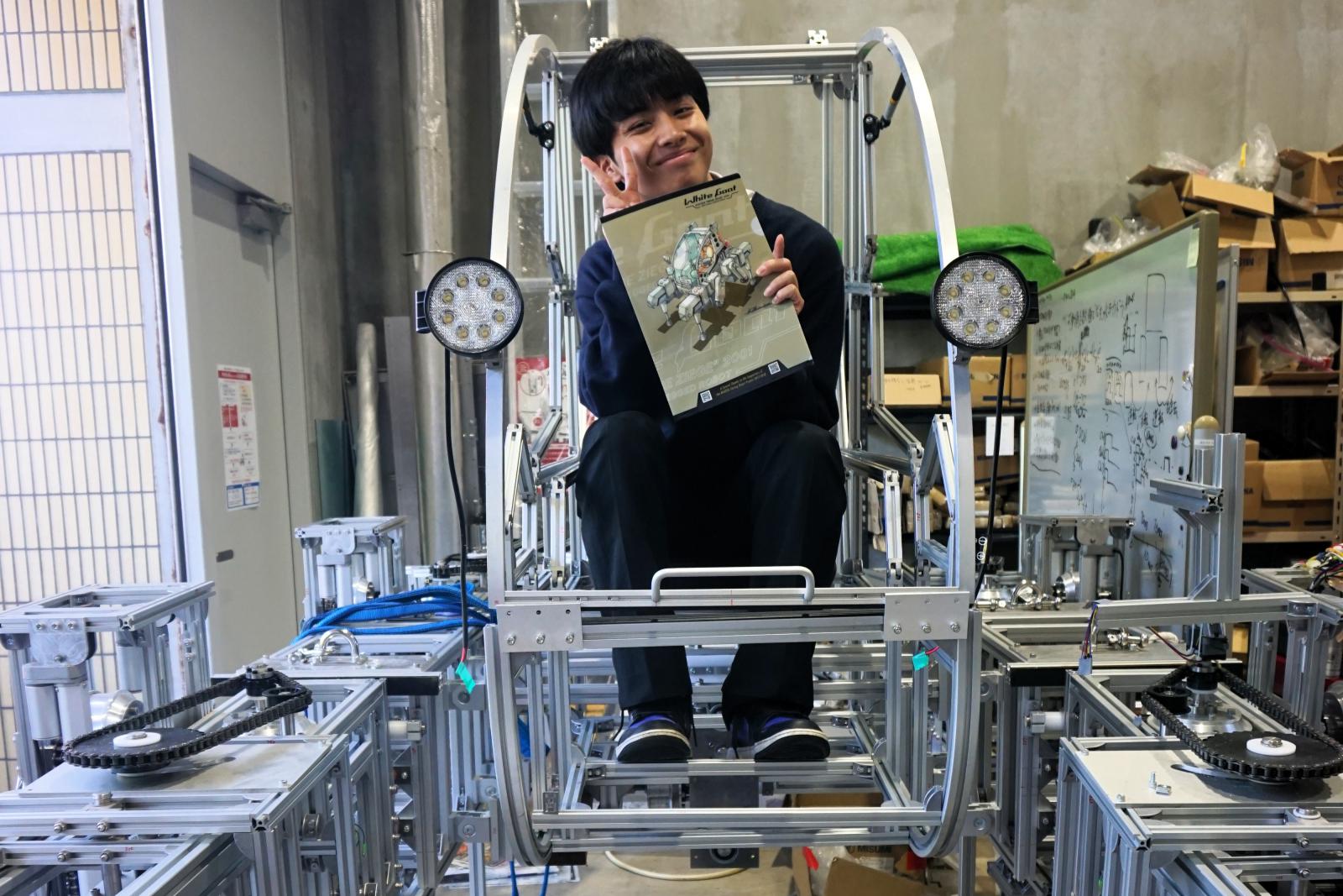 施設見学では、図書館や創造工房など本学ならではの施設を見学。大学院棟では、齋藤教授が開発している多脚ロボを見学し実際に乗車しました。巨大なロボットに乗るという滅多にない機会に興奮を隠せない様子でした。