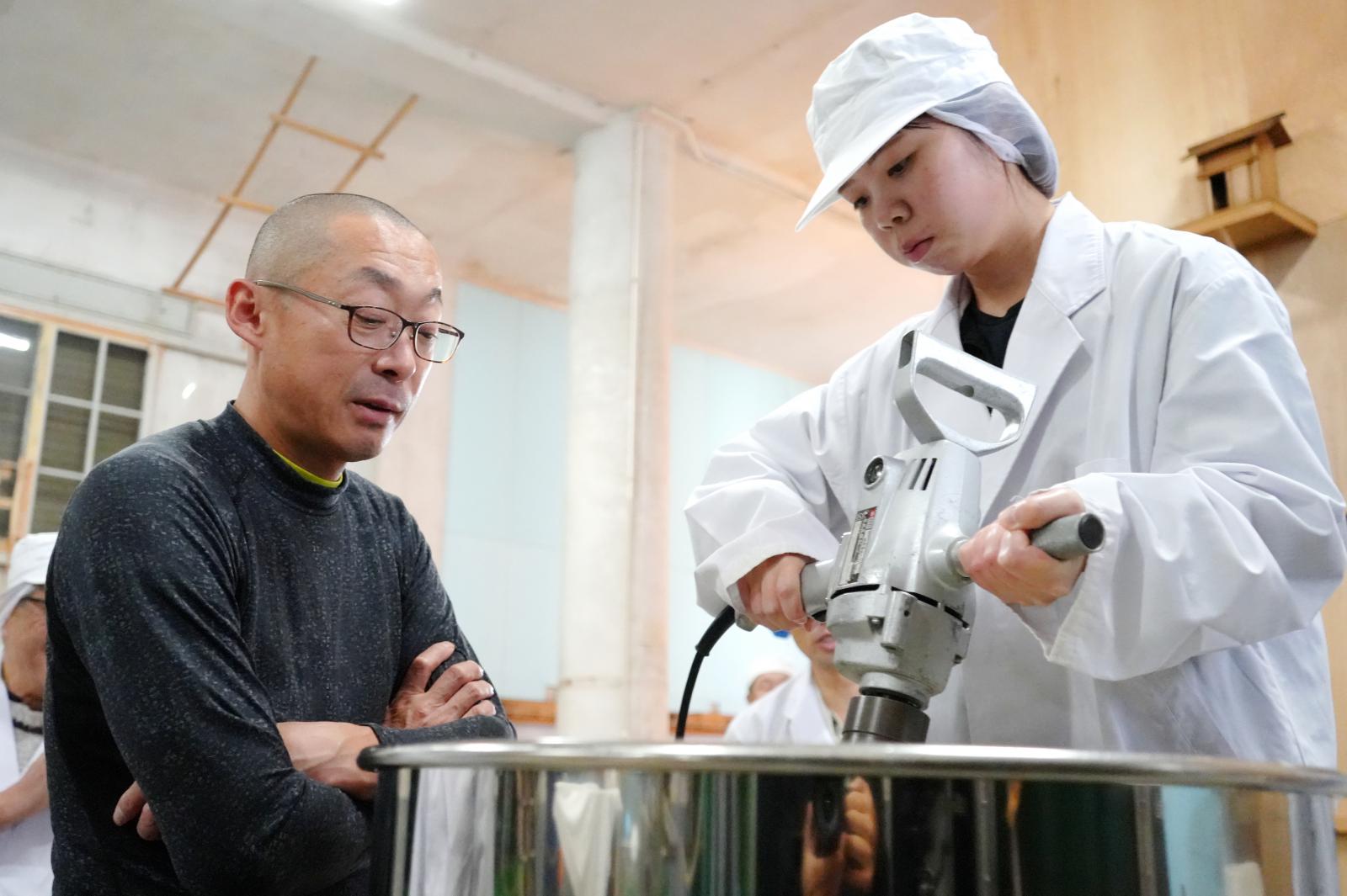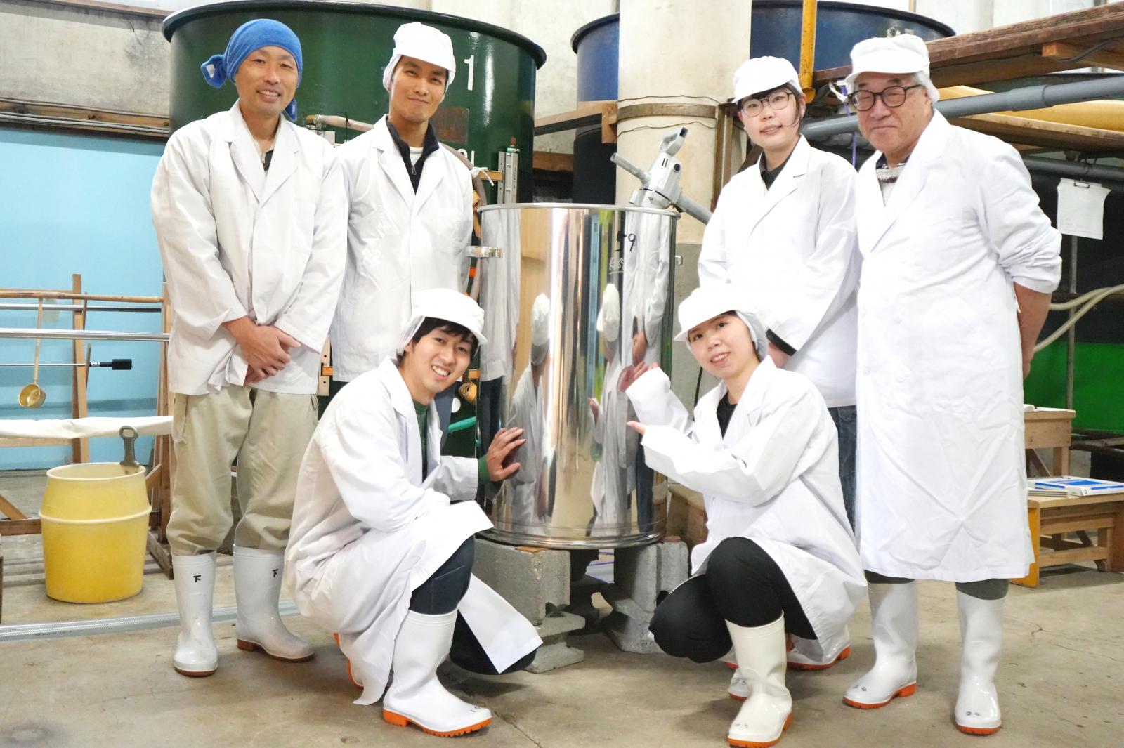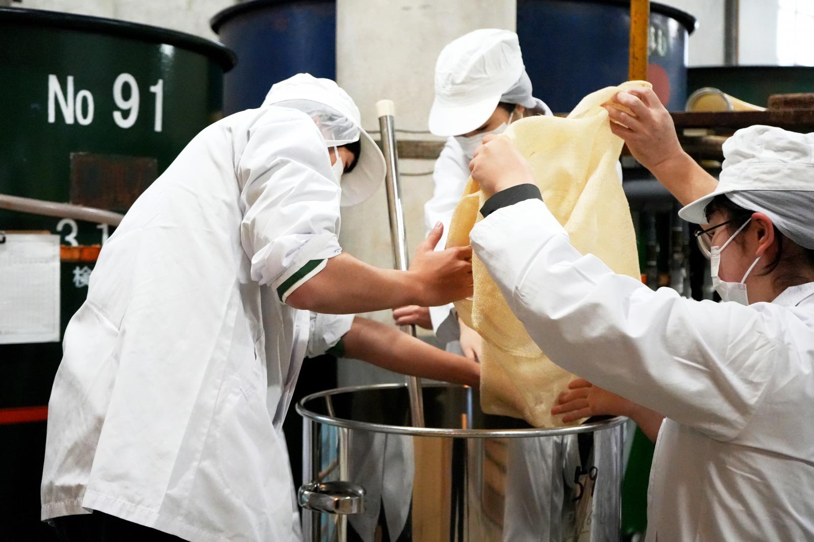 11月23日(土)、究プロジェクトのメンバー5人といつでも青春キャンパス・シニア大学生の渡辺謙吉さん(70歳)が参加し、日本酒造りの根幹となる「酒母づくり」を行いました。健全な酵母を培養し、力強い醪(もろみ)を育むための大切な作業で、杜氏や蔵人の皆さんのサポートのもと、細心の注意を払いながら、酒造りの基礎を固めました。