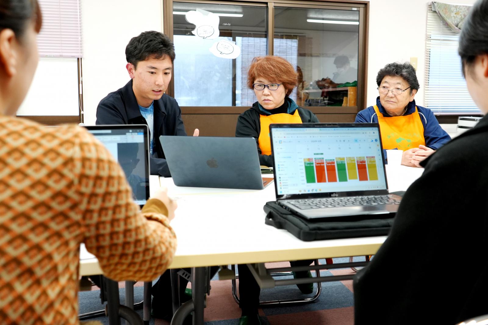 当日は、「陽気な母さんの店」の石垣一子会長と佐々木幹子代表取締役に対し、これまでの調査の状況を説明しました。学生たちは「これまで会員の農家の女性が生きがいや自己実現のために、自宅で加工した漬物を直売所で販売していた。しかし、高齢化により農産物を施設まで一人で運び込むのが難しくなり、食品衛生法改正を機に引退した人が多いのではないか」と分析しました。解決策として、「複数の農家会員で協力することで運搬の課題は解決できる。グループに分けて漬物を漬ける日時を合わせるということも考えられる。」さらに、学生たちからは、漬物加工所に専属の従業員を雇用する提案も出されました。その上で、漬物加工所を効率的に稼働させるためインターネット上でスケジュールを共有し、交代制で利用する仕組みを導入する案や、専従の従業員が直売所ならではの漬物を加工できるように「レシピ集」としてまとめるなどの提案を示しました。