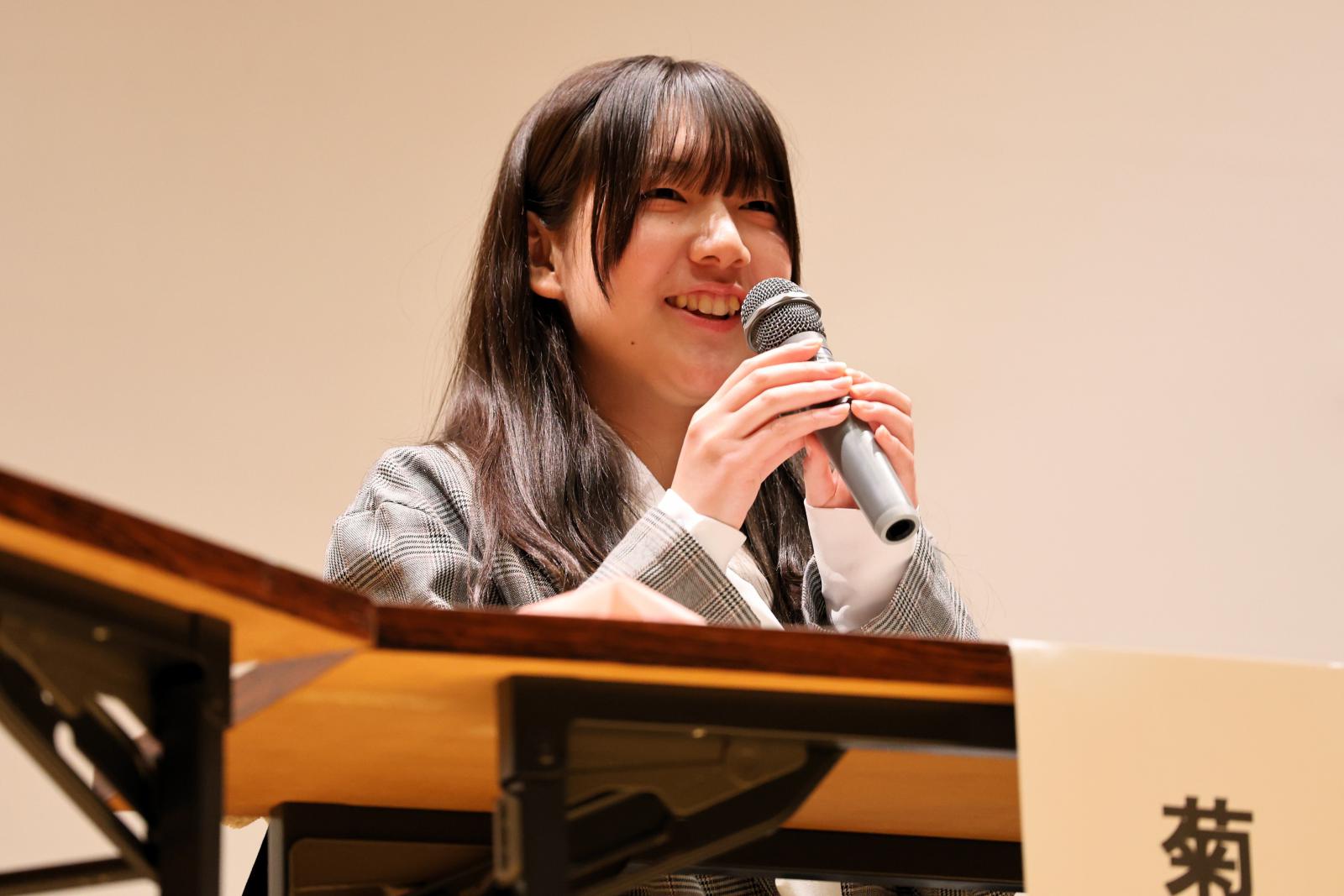 生物資源科学部1年の学生5名によるトークセッションと、学生自主研究発表が行われました。トークセッションでは、学部学科を選ぶ際のポイントや、大学生活での取り組みのほか、高校生から寄せられた多数の質問に答えるなど、進路選択の参考になる有意義な機会となりました。応用生物科学科1年の菊地 莉子さん(御所野学院高校卒)からは、自身の高校生活での経験を交えて、高校生へ応援のメッセージを送られ、高校生は輝く先輩の姿に、大学生活への期待を膨らませたようでした。