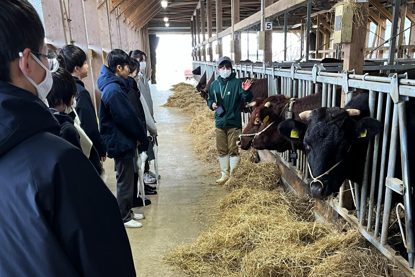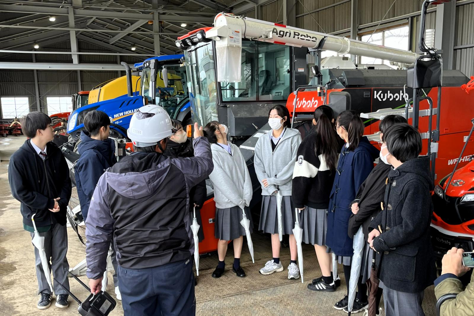 はじめに、AICの概要説明と秋田の農業の現状やAICが取り組むスマート農業についての説明がありました。高校生は熱心に耳を傾け、質問をしたりメモをとるなどして理解を深めていました。施設見学では、園芸温室、牛舎、スマート農機の展示など、AICの特長的な施設・設備を見学しました。スマート農機の紹介では、ロボットトラクターや農業用ドローンの実演があり、最先端農業技術がどのように活かされているのかを間近で体感しました。