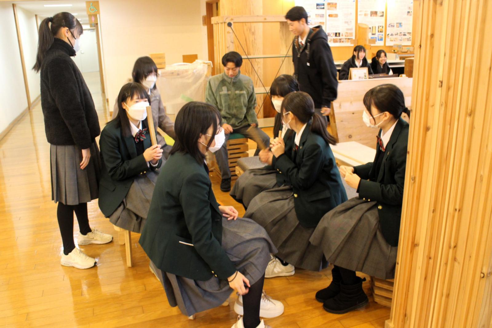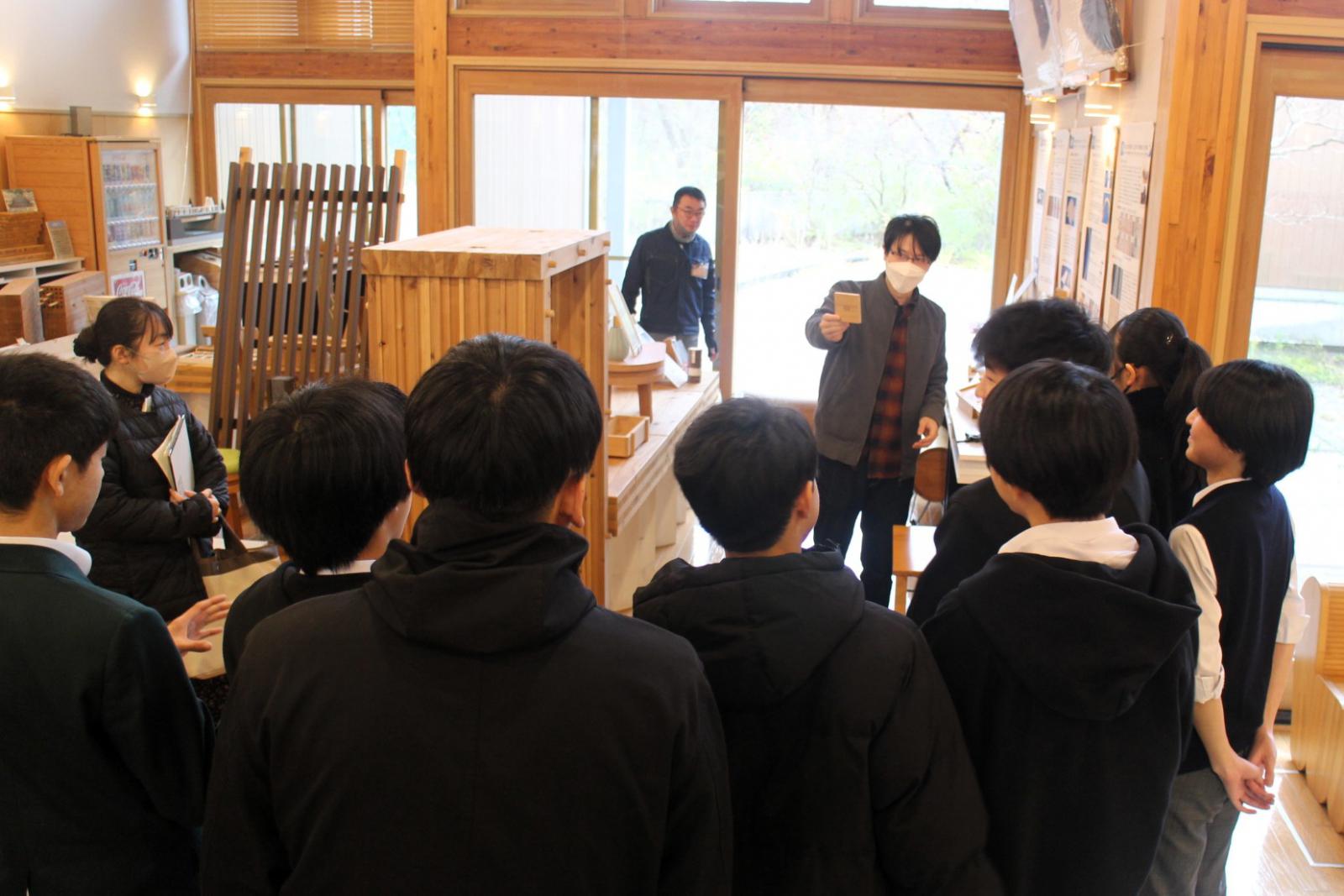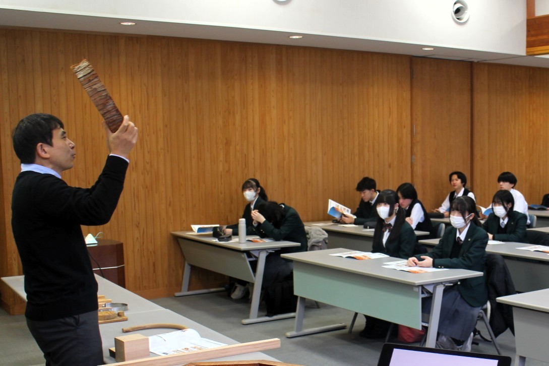 研究紹介では、足立 幸司教授[専門:木材加工学]から『様々な木材加工』と題し、木材の性質や加工方法、木と文化のつながりについて説明がありました。エントランスには、同研究所がこれまで企業と共同開発した様々な製品が展示されており、高校生は、木材を加工した小物に触れたり、足立教授が(株)イトーキと製品化したバネバネ椅子に座ったりするなど、木のぬくもりや魅力を実感したようでした。