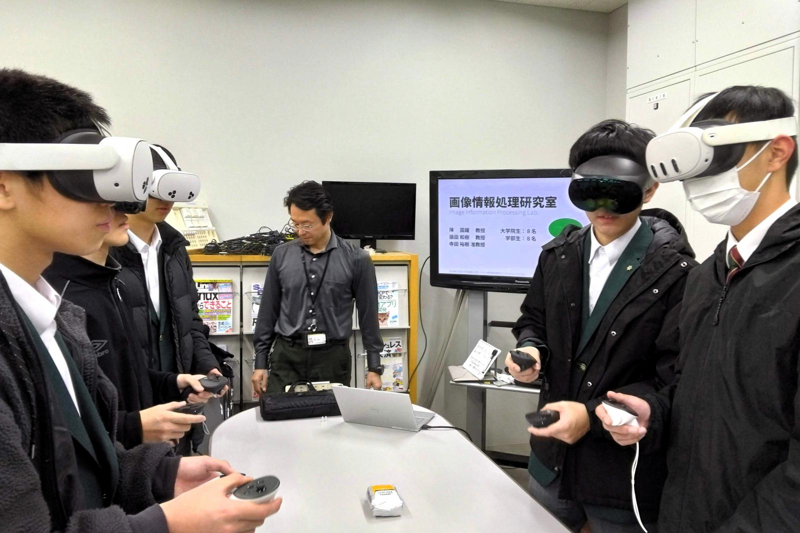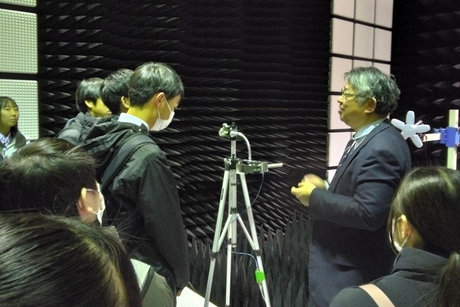 システム科学技術学部および各学科の説明のあと、施設見学を行いました。施設見学では、アンテナの放射特性を測定・評価するための実験室『電波無響室』や創造工房など、特長的な施設・設備を見学しました。情報工学科の画像情報処理研究室の見学では、研究紹介のあと、実際に研究で使われているMR体験用の装置を体験しました。高校生は、大学ならではの研究機器に触れたことで、科学への興味が高まったようでした。
