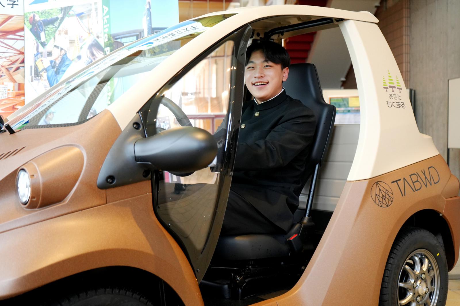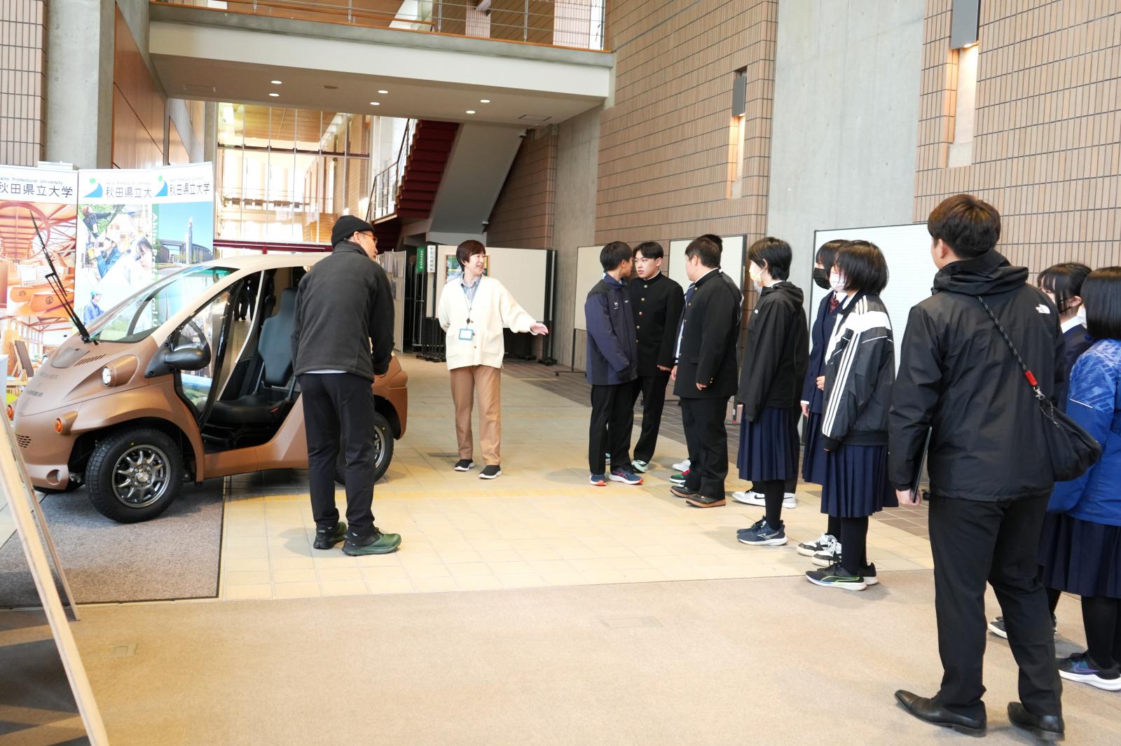 2班に分かれて、講堂・図書館・学部棟・カフェテリアなど、本学の特長的な施設を回りました。講堂前では、秋田スギから生まれた小型電気自動車「あきた もくまる」がお披露目されており、木材高度加工研究所が行う木材の研究や技術開発について学びました。中学生からは、「車の乗り心地を体験できたのが楽しかった!」「県立大は農学系や工学系を学べる大学だと思っていたけれど、幅広いジャンルの研究ができることを知って驚いた」といった感想があがりました。見学中には、本学生から「大学は楽しいよ!まずは高校受験頑張って!」と声をかけてもらう場面もあり、一日を通して大学教員や大学生と交流したことで、大学をより身近に感じていただけました。