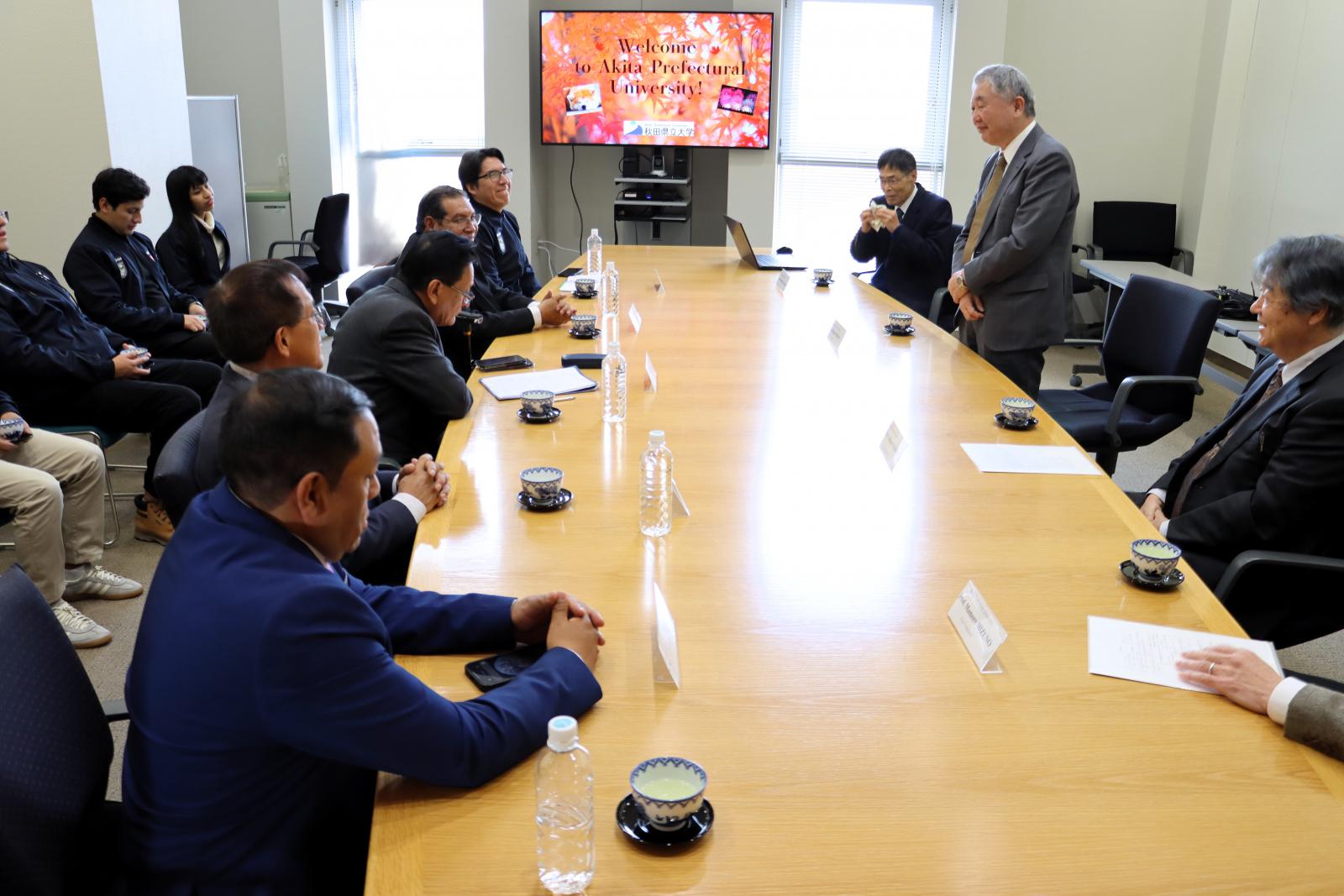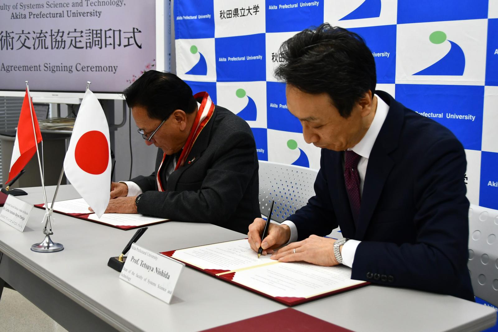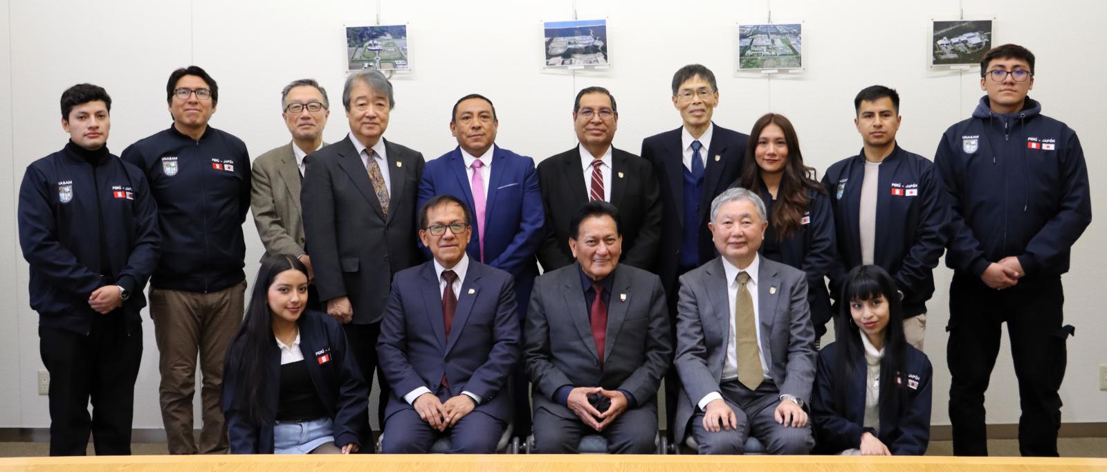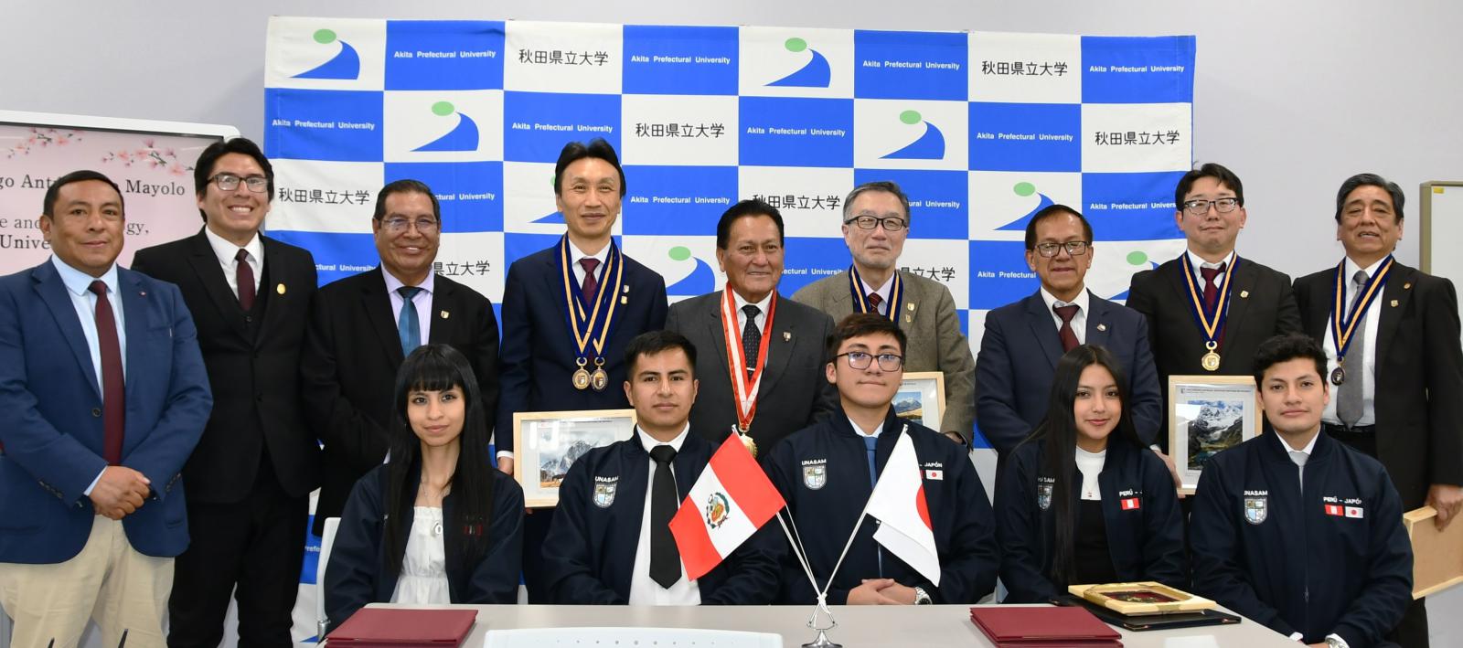秋田県立大学システム科学技術学部は、ペルー共和国のサンチアゴ・アントゥネス・デ・マヨロ・アンカシュ州国立大学(UNASAM)と部局間協定を締結しました。令和7年11月20日(木)~27日(木)の8日間、同大学より学長をはじめとした教員5名、学生6名の訪問団が来学し、協定書に調印しました。滞在期間中は、調印式のほか、福田 裕穂学長への表敬訪問や各キャンパスの施設見学、秋田市内の史跡名勝の視察など、様々なプログラムが実施されました。