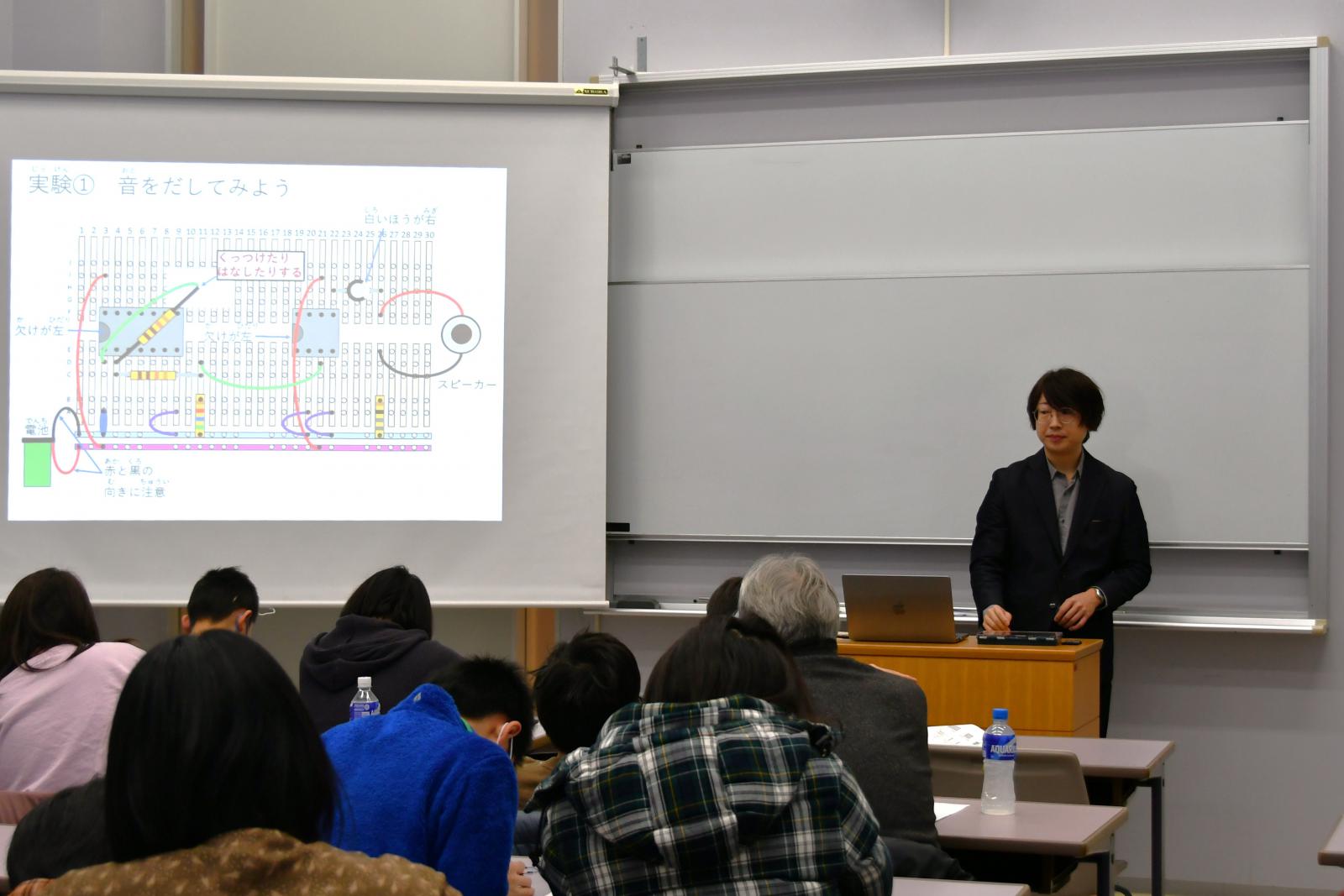 続いて、太鼓などの楽器と電子楽器の違いについて解説がありました。一般的な楽器は物体の振動によって音が生まれるのに対し、電子楽器では電気回路によって電気が振動し、その信号をスピーカーにつなぐことで音に変換できることを学びました。