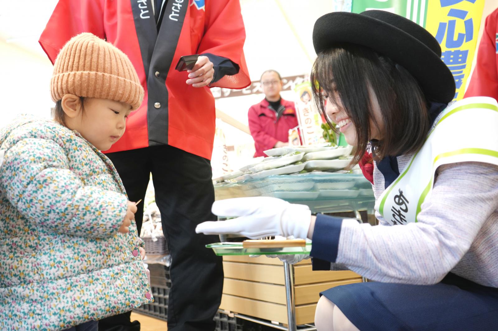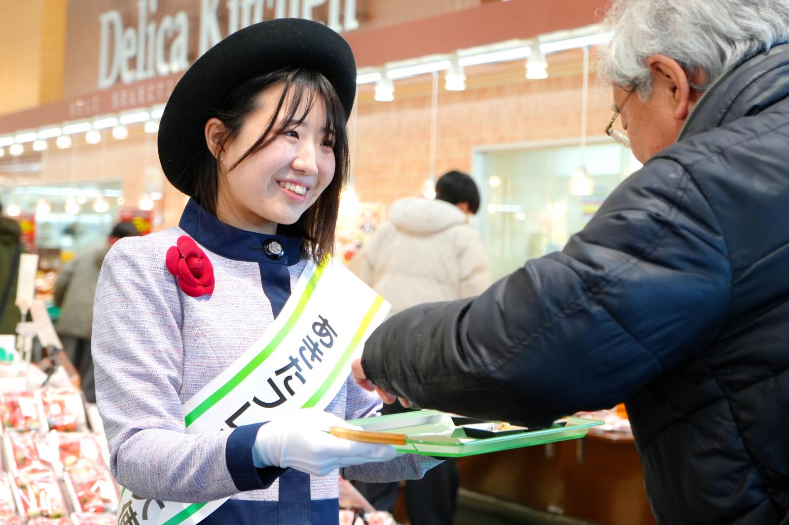 特に、調理方法についての質問には、応用生物科学科で培った知識も交えながら、「天ぷらはもちろん、さっと茹でてマヨネーズ和えにするのもおすすめですよ」と、具体的な食卓の彩り方を丁寧に提案しました。お客様からも「若い学生さんが頑張っているね」「今日のおかずの一品にするわ」といった温かい言葉がけがあり、売り場は終始和やかな雰囲気に包まれました。