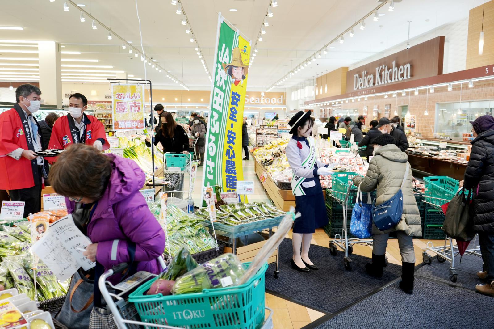 当日は、JA秋田ふるさと管内(横手市周辺)から届いたばかりの、鮮やかな緑色が眩しい「こごみ」が店頭に並びました。後藤さんは、来店されたお客様一人ひとりに「今が旬の、冬の山菜はいかがですか」と笑顔で声をかけ、対面販売を実施。ハウス栽培ならではの「アクが少なく、下茹でなしでも手軽に調理できる」という魅力やおすすめの食べ方などを、主婦層や買い物客へ熱心に伝えました。