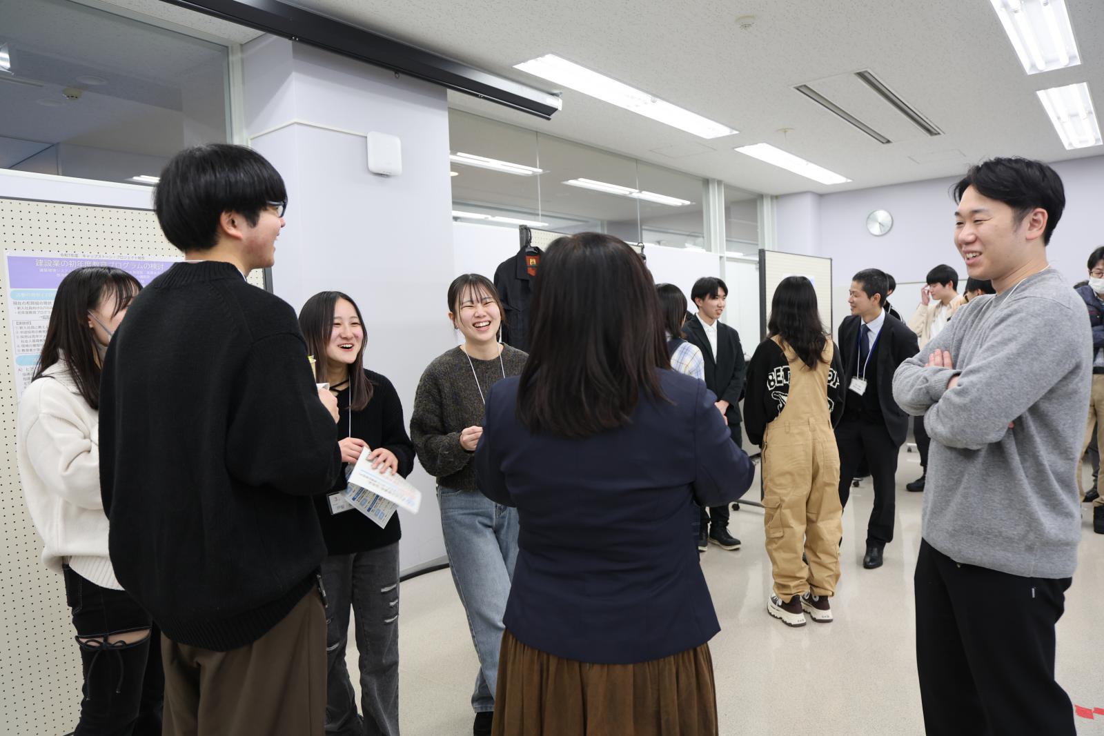 発表後には、ポスターを自由に閲覧できる時間が設けられ、協力団体の皆様と発表を終えた学生たちが、リラックスした雰囲気の中で終始和やかに意見交換を行う様子が見られました。協力団体からは、「社内では思いつかない、学生ならではの視点やアイディア、そして着地点に驚かされた」「学生と活動する中で非常に勉強になった。来年度以降も引き続き一緒に取り組みたい」「初の試みに不安もあったが、学生の優秀さに感銘を受け、秋田県立大学の学生の高い能力を実感した」などのコメントが寄せられました。