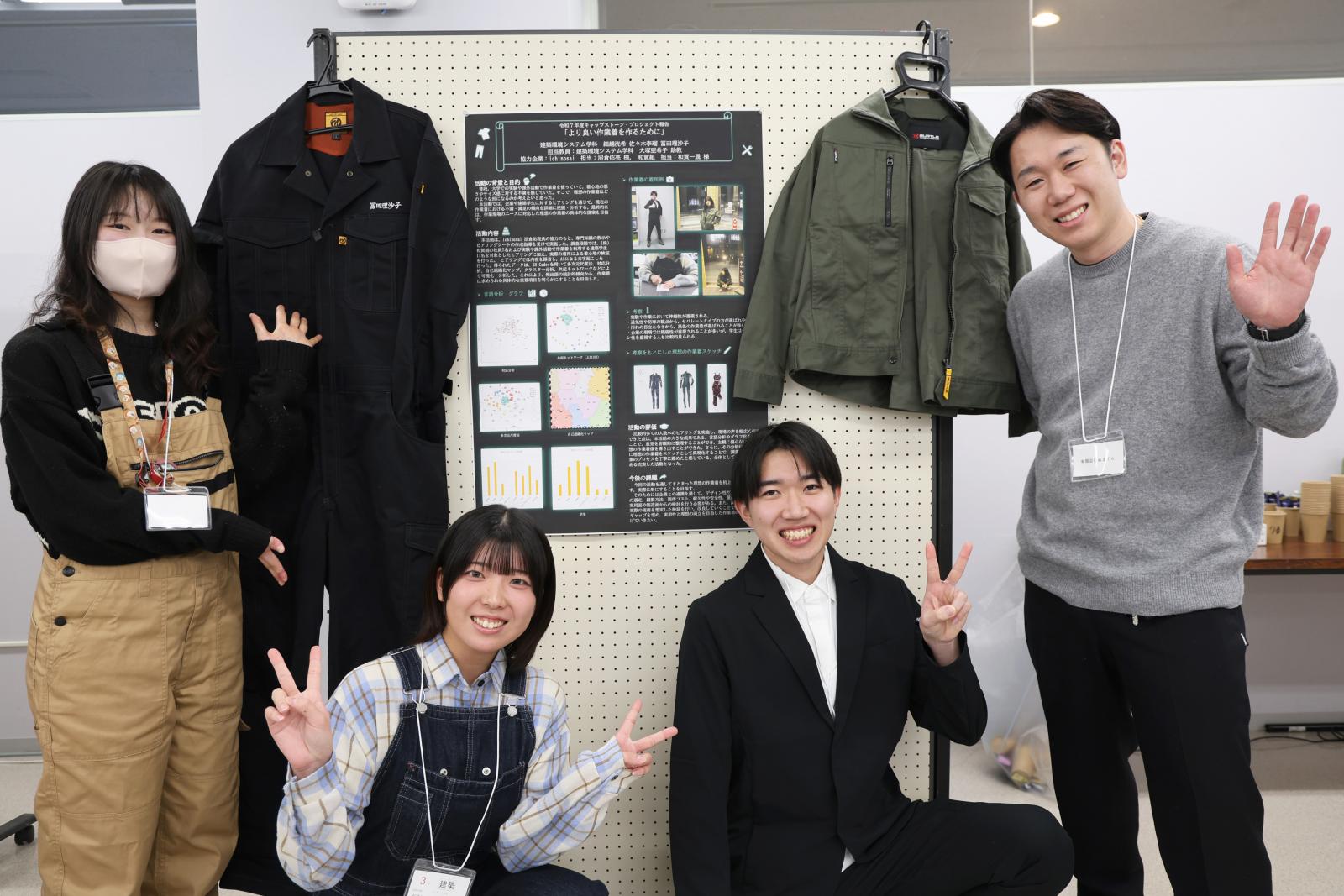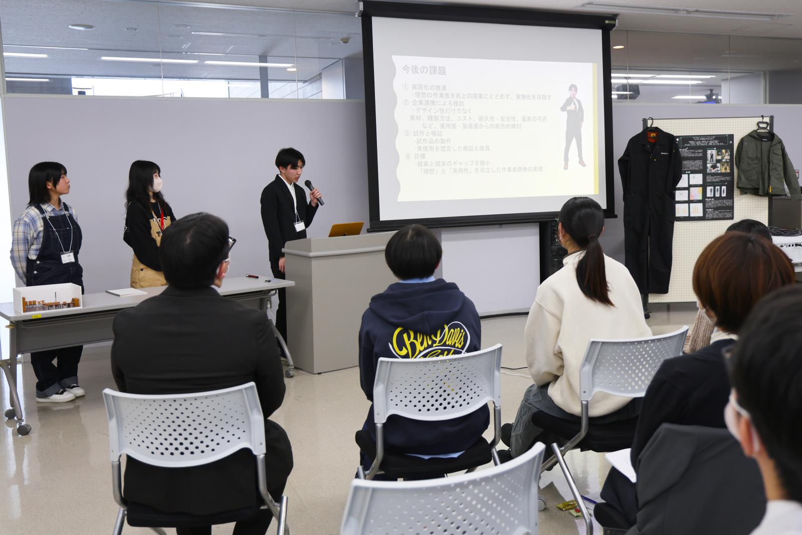 発表会では、協力団体から挙げられた課題に対して、学生が半年間かけて取り組んだ成果を発表しました。発表はポスターセッション形式で行われ、各グループは制作したポスターやスライド資料を用いて説明。あわせて、模型やパンフレット、作業着の見本など、課題に関する成果物の展示・紹介も行われ、参加者は熱心に説明に耳を傾けるとともに、随所で感嘆の声を上げていました。