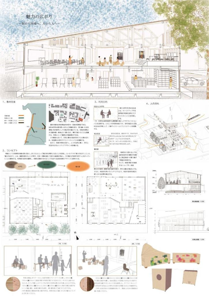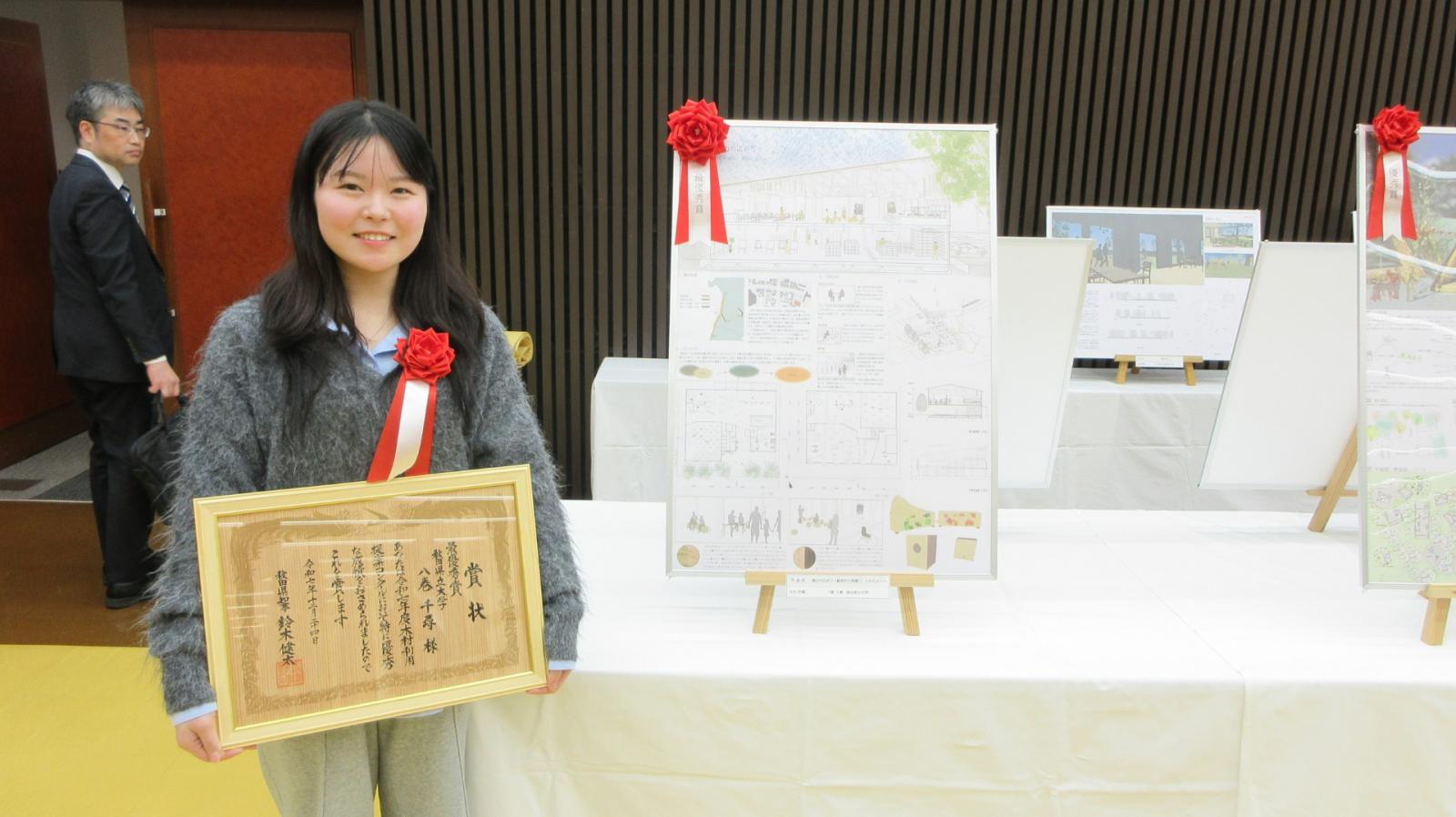 木材を利用したこれからの社会で必要と考えられる空間づくりのアイデアを募集する「令和7年度 木材利用提案コンクール」において、最優秀賞を八巻千尋さん(システム科学技術学部建築環境システム学科3年・計画学講座)、優秀賞2点を遠藤勇翔さん(システム科学技術学部建築環境システム学科3年・計画学講座)と髙橋あおいさん(システム科学技術学部建築環境システム学科3年・構造学講座)、特別賞を伊藤優花さん(システム科学技術学部建築環境システム学科3年・構造学講座)が受賞しました。