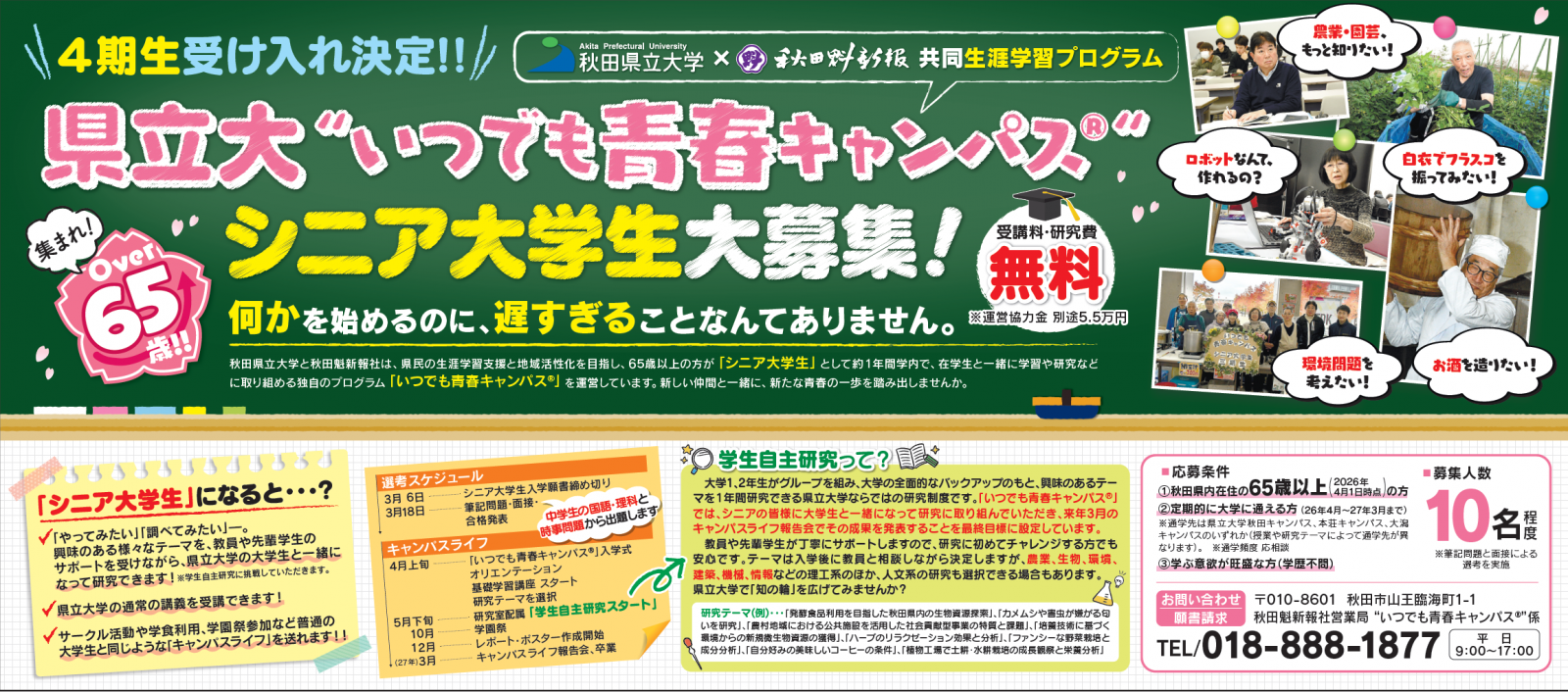 人生100年時代、高齢化率が全国で最も高い本県において、健康でイキイキと暮らしていくためには、生涯を通して必要な時に必要な学びを通じて生活の質を維持・向上させることが不可欠です。本学と秋田魁新報では、県民の生涯学習支援と健康寿命の延伸、さらには地域の活性化を目指し、65歳以上の方を「シニア大学生」として受け入れ、在学生と一緒に学習や研究、課外活動に取り組めるプログラム『いつでも青春キャンパス』を連携・展開しています。この度、シニア大学生・四期生を募集します。何かを始めるのに、遅すぎるなんてことはありません。あなたもシニア大学生として、新たな青春の一歩を踏み出しませんか!!先輩のキャンパスライフの様子は、こちらをご覧ください。応募条件