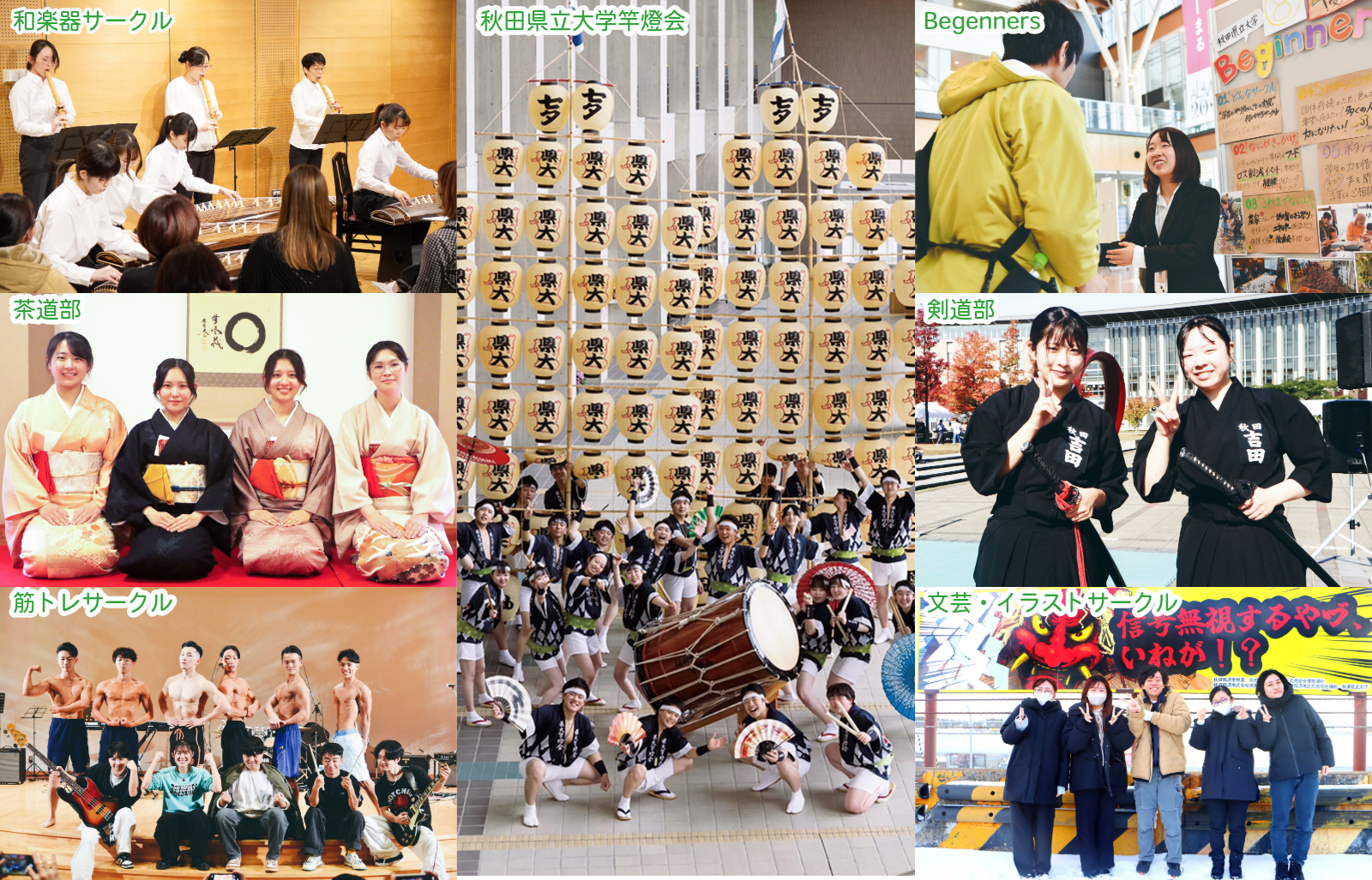 令和7年4月1日現在、秋田キャンパス・大潟キャンパス・本荘キャンパス合わせて、体育系37団体、文化系62団体のサークルが組織され、各種大会や学園祭において日頃の活動の成果を披露しています。秋田県立大学竿燈会、ツリーハウスサークル、ものづくりサークル S.E.I.M.など、本学の特色をいかした個性的でユニークなサークル&同好会が活発に活動しています。本荘キャンパス